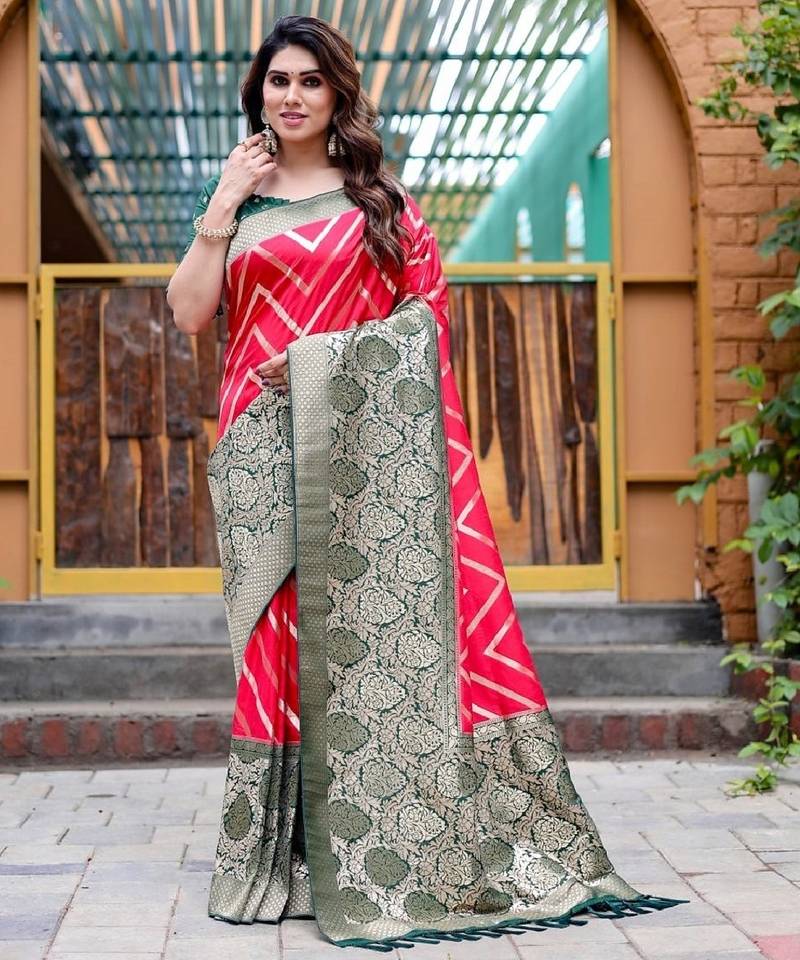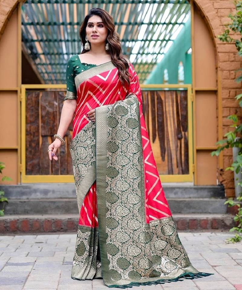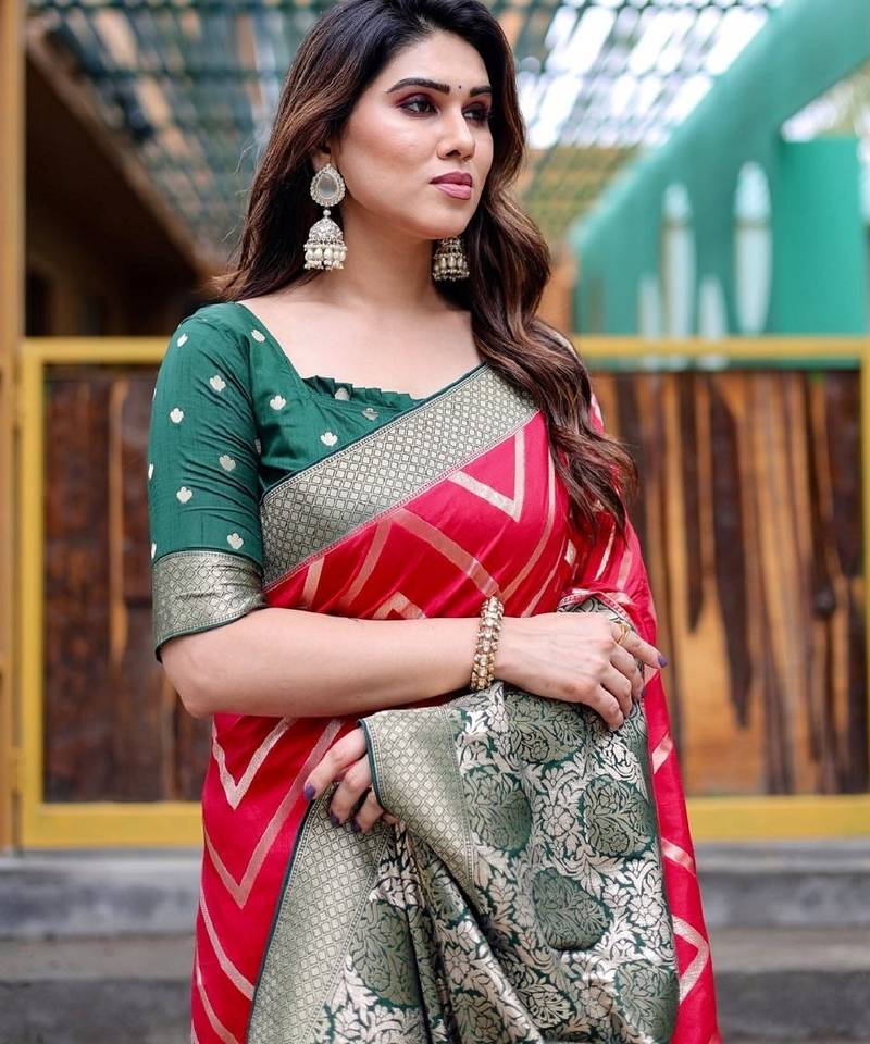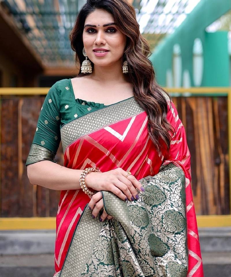Red soft silk blend banarasi jacuard work designer party wear saree with unstitched blouse piece