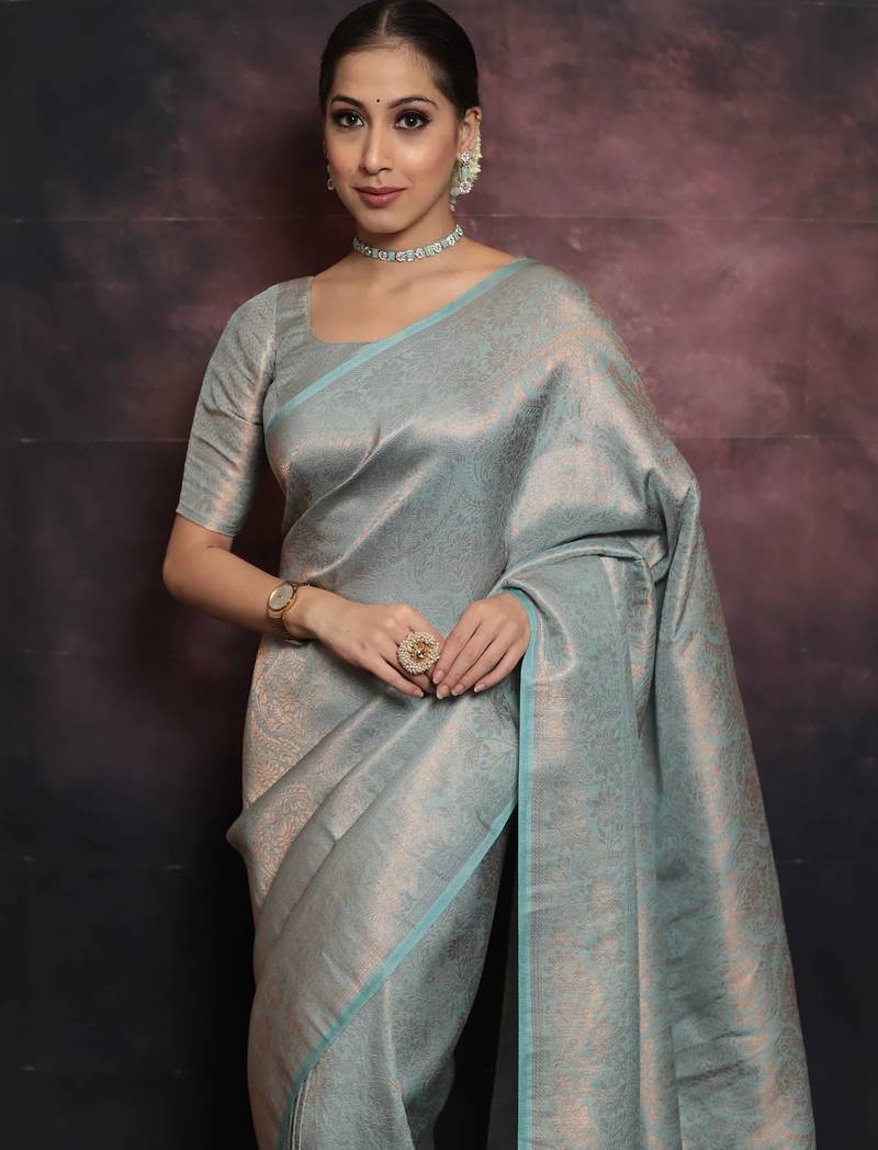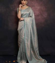 Sky blue soft art silk banarasi jacuard work designer party wear saree with unstitched blouse piece