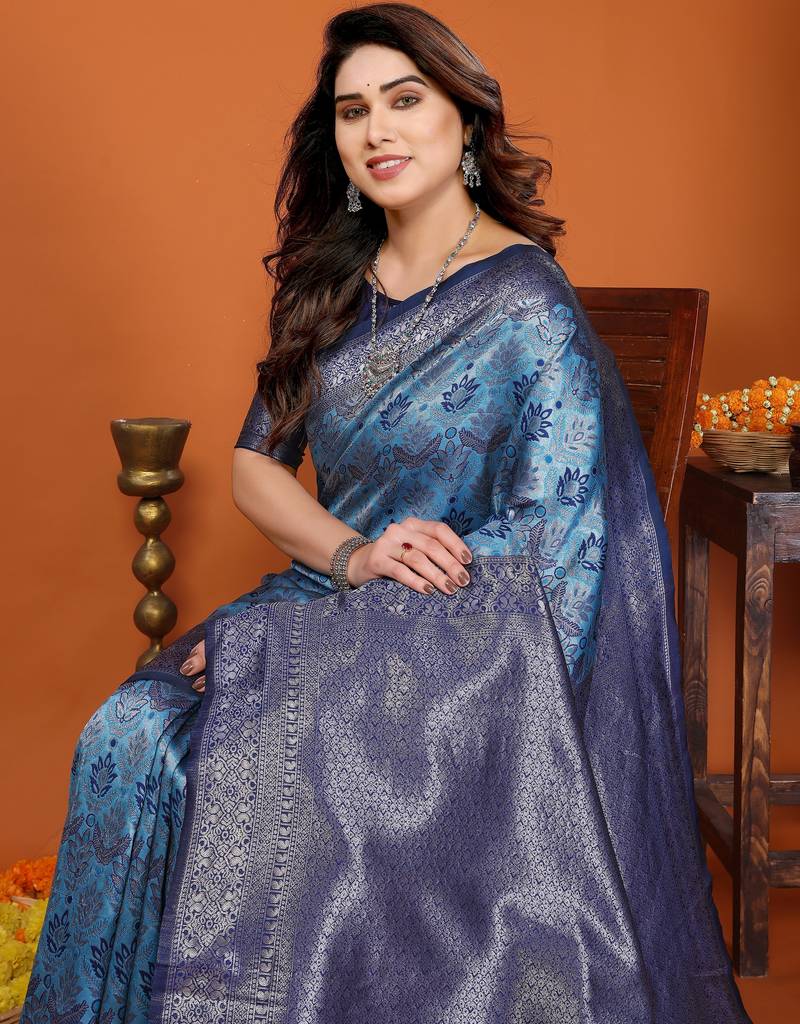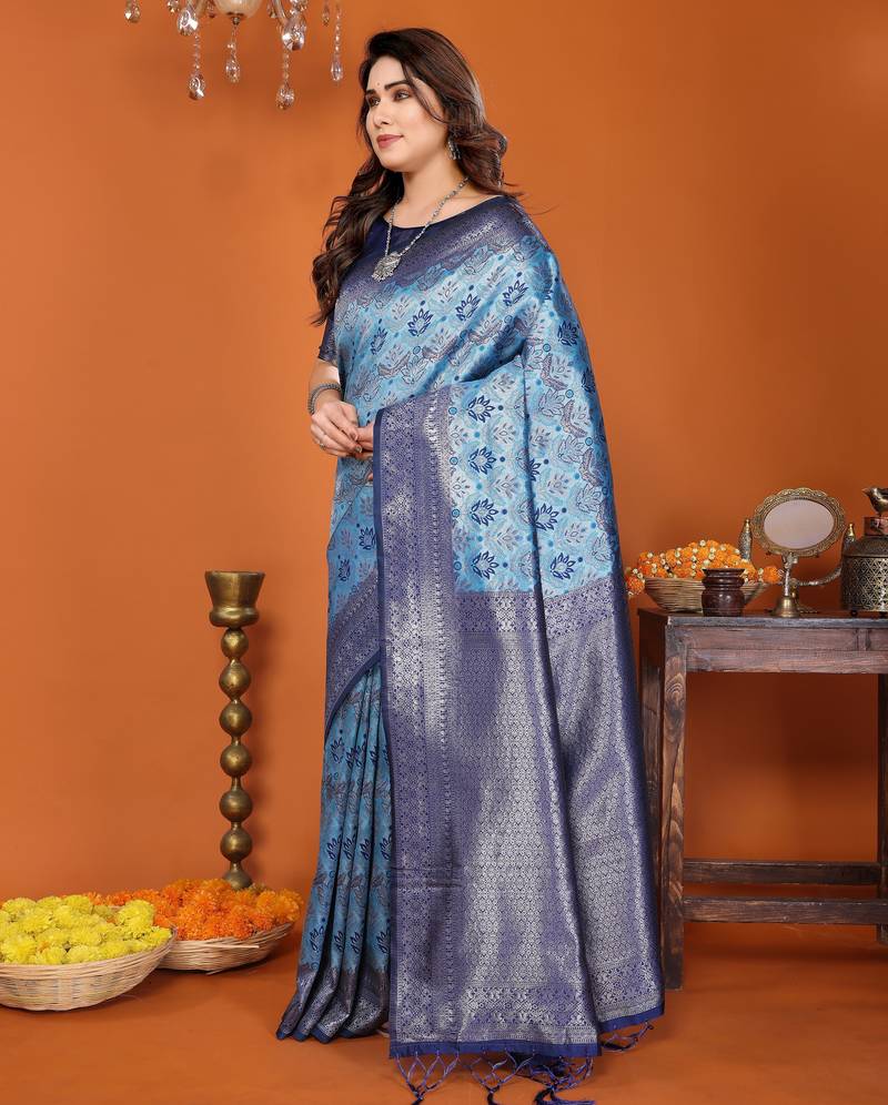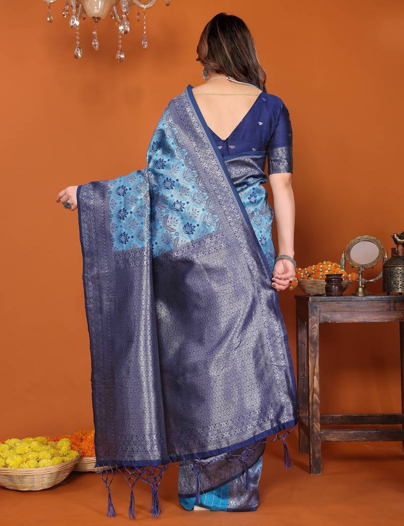 Sky blue soft art silk blend banarasi jacuard work designer party wear saree with unstitched blouse piece