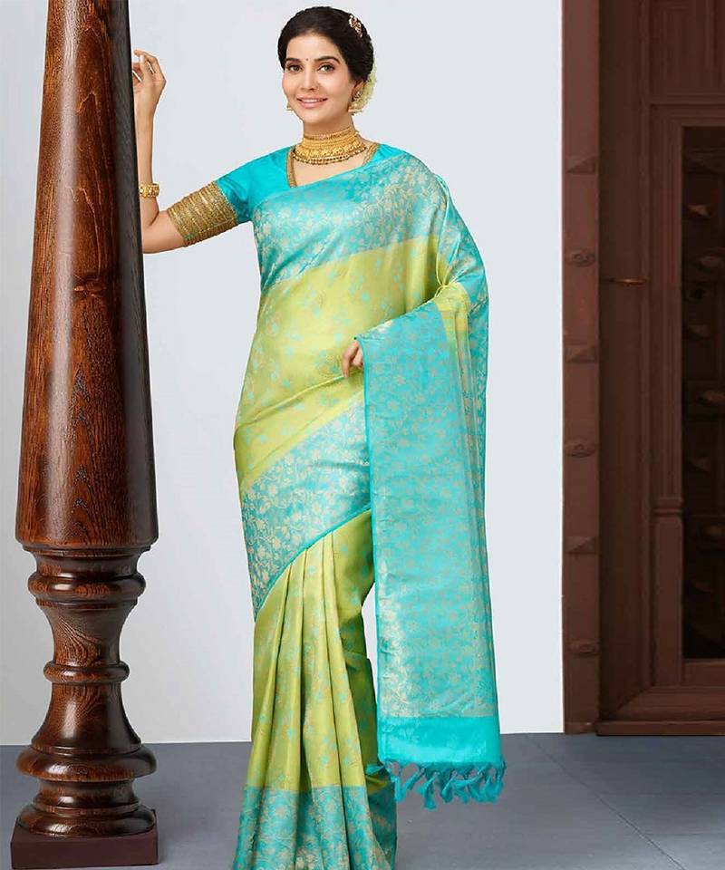 Sky lemon soft silk blend banarasi jacuard work designer party wear saree with unstitched blouse piece