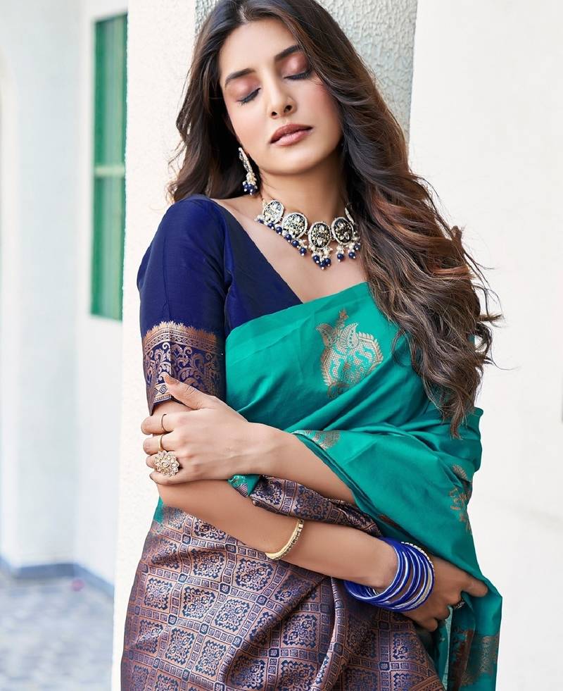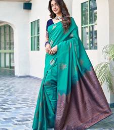 Teal green soft silk blend banarasi jacuard work designer party wear saree with unstitched blouse piece