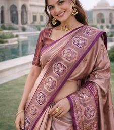 🌸 Design Details The Saree Features A Soft Peach Base Adorned With Delicate Woven Motifs That Enhance Its Royal Charm. The Rich Wine Colored Border And Pallu Are Intricately Designed With Traditional Banarasi Zari Weaving, Adding Depth, Contrast, And Grandeur To The Overall Look. The Ornate Zari Work Reflects Classic Heritage Craftsmanship, Making This Saree Ideal For Festive Occasions, Weddings, Cultural Events, And Celebrations. 👗 Blouse Details