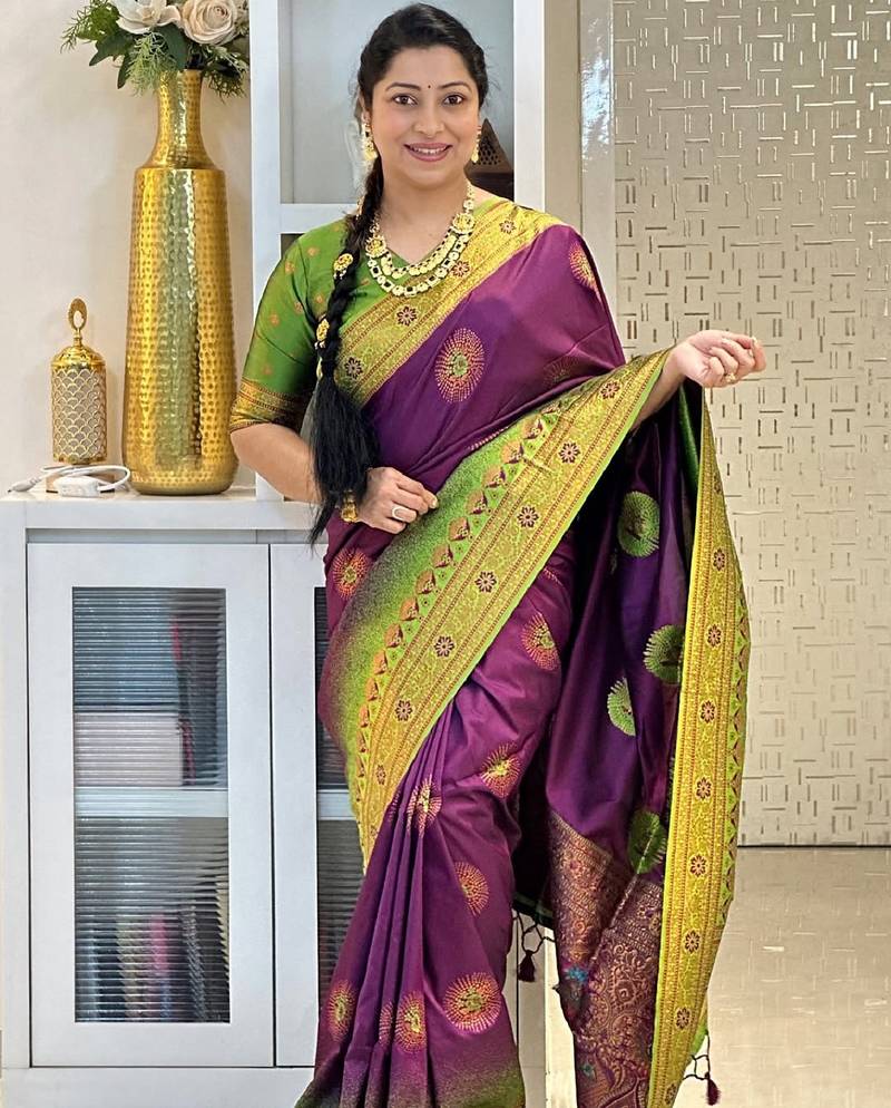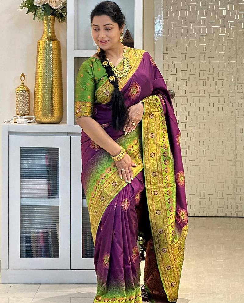 Wine mehendi soft art silk blend banarasi jacuard work designer party wear saree with unstitched blouse piece