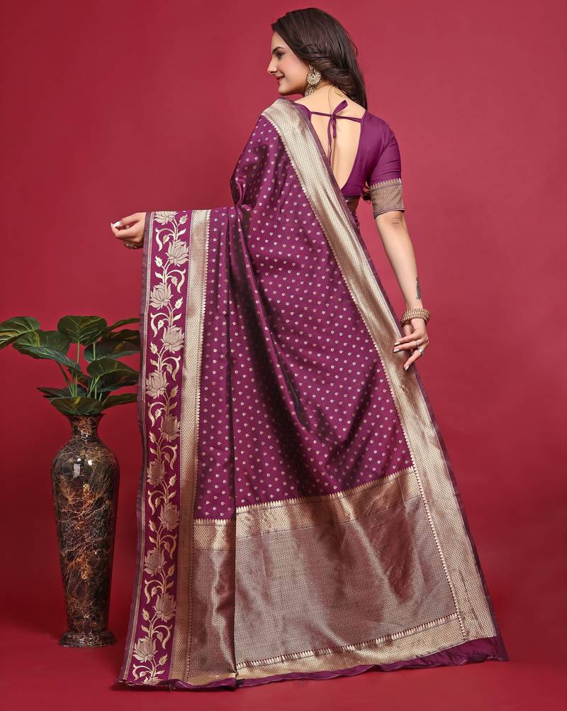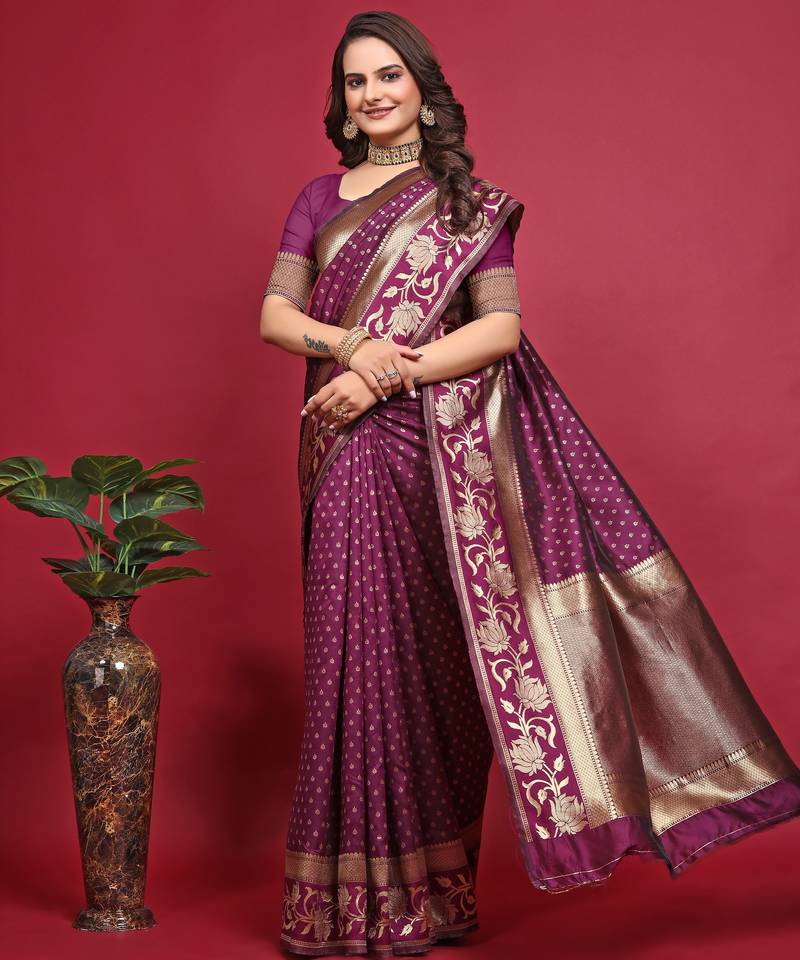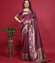 Wine soft silk blend banarasi jacuard work designer party wear saree with unstitched blouse piece