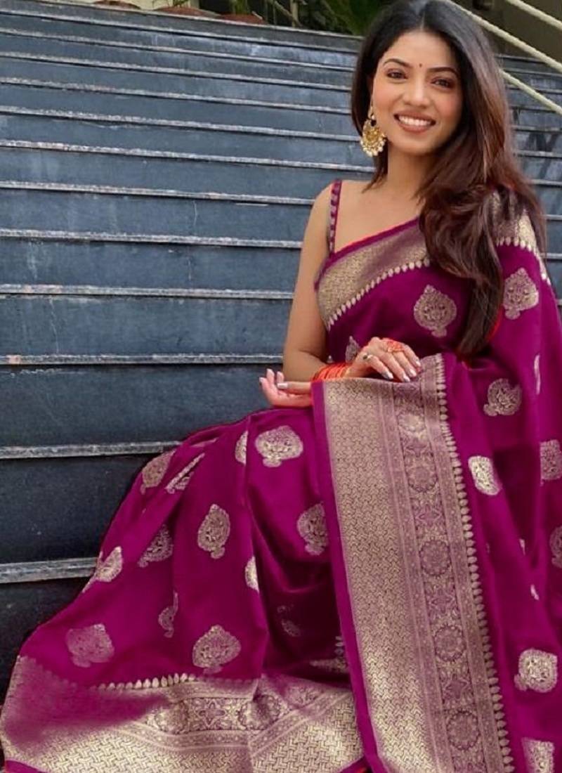 Wine soft art silk banarasi jacuard work designer party wear saree with unstitched blouse piece