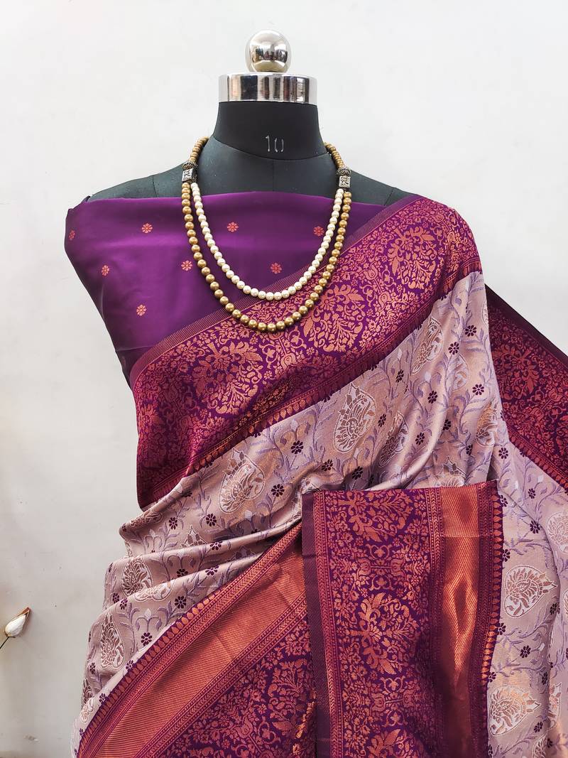 Wine soft silk blend banarasi jacuard work designer party wear saree with unstitched blouse piece