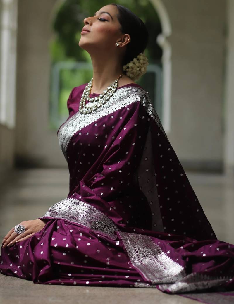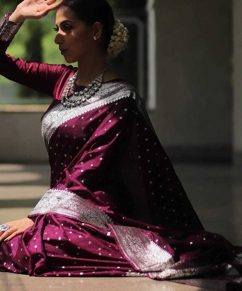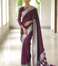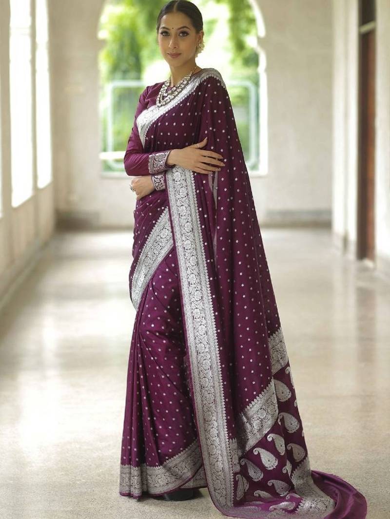 Wine soft silk blend banarasi jacuard work designer party wear saree with unstitched blouse piece