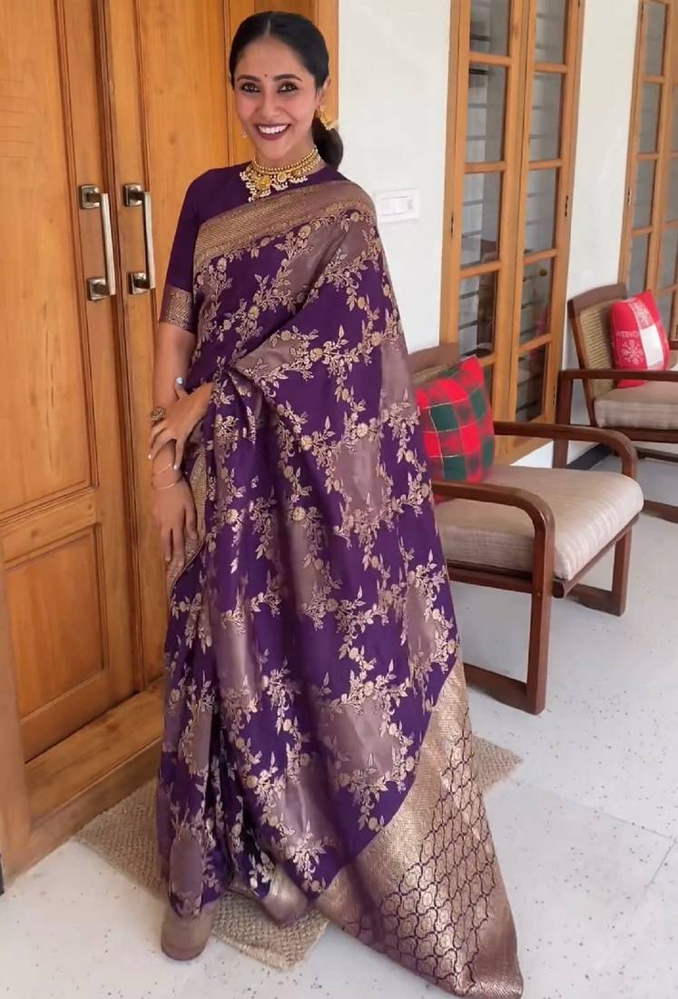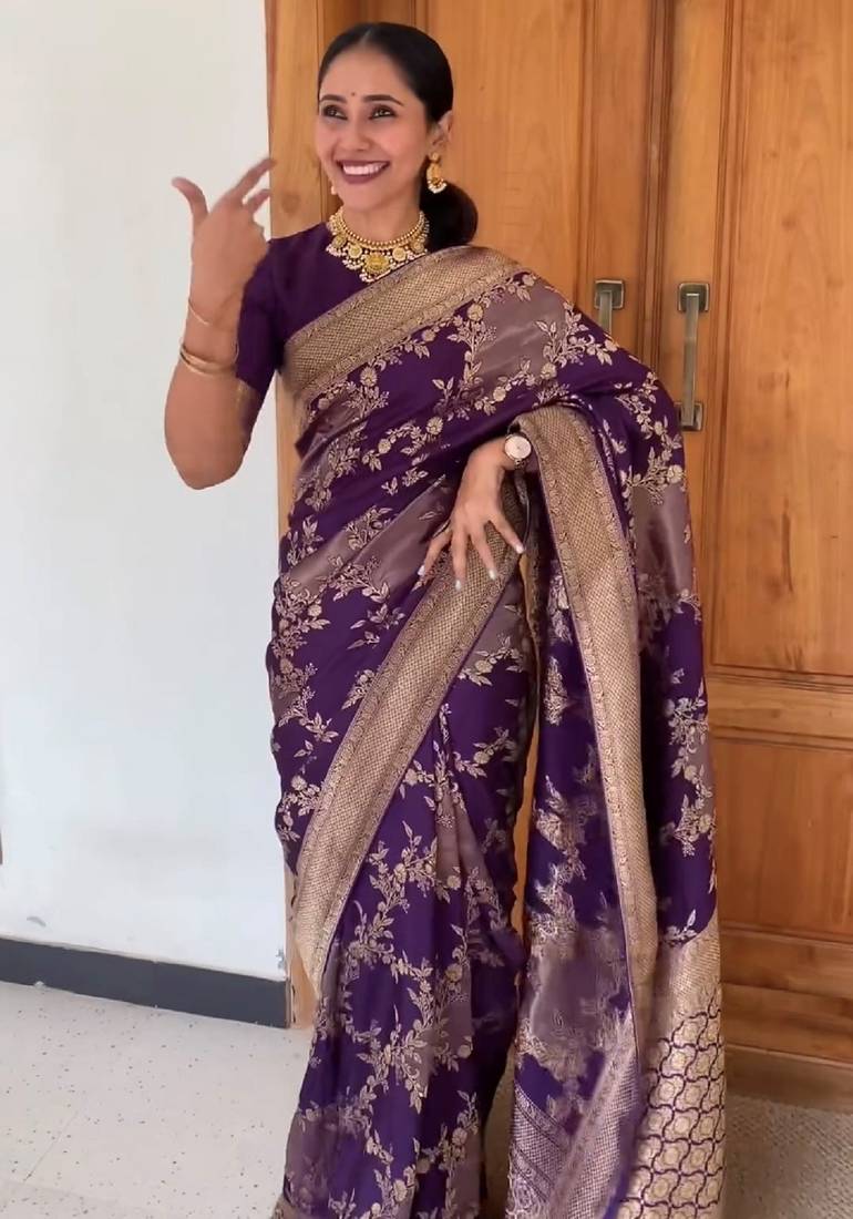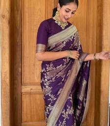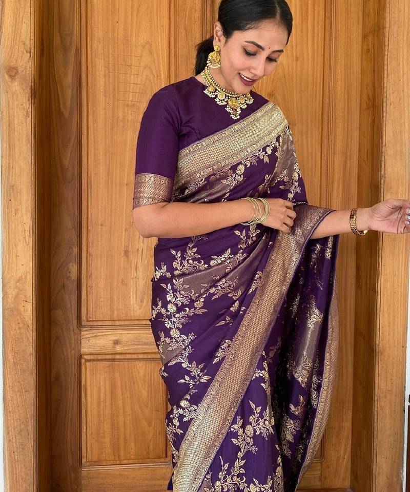 Wine soft silk blend banarasi jacuard work designer party wear saree with unstitched blouse piece