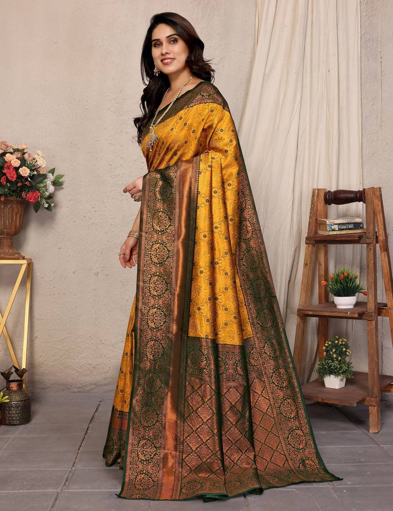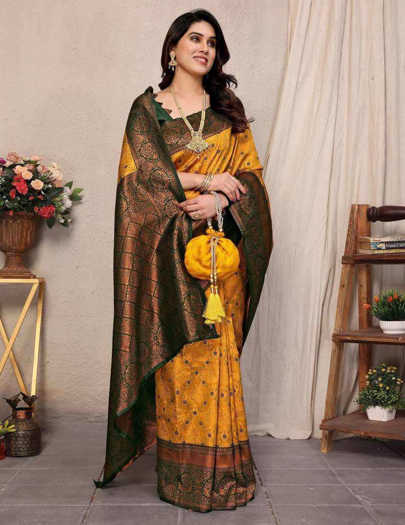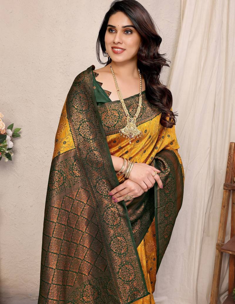 Yellow green soft silk blend banarasi jacuard work designer party wear saree with unstitched blouse piece