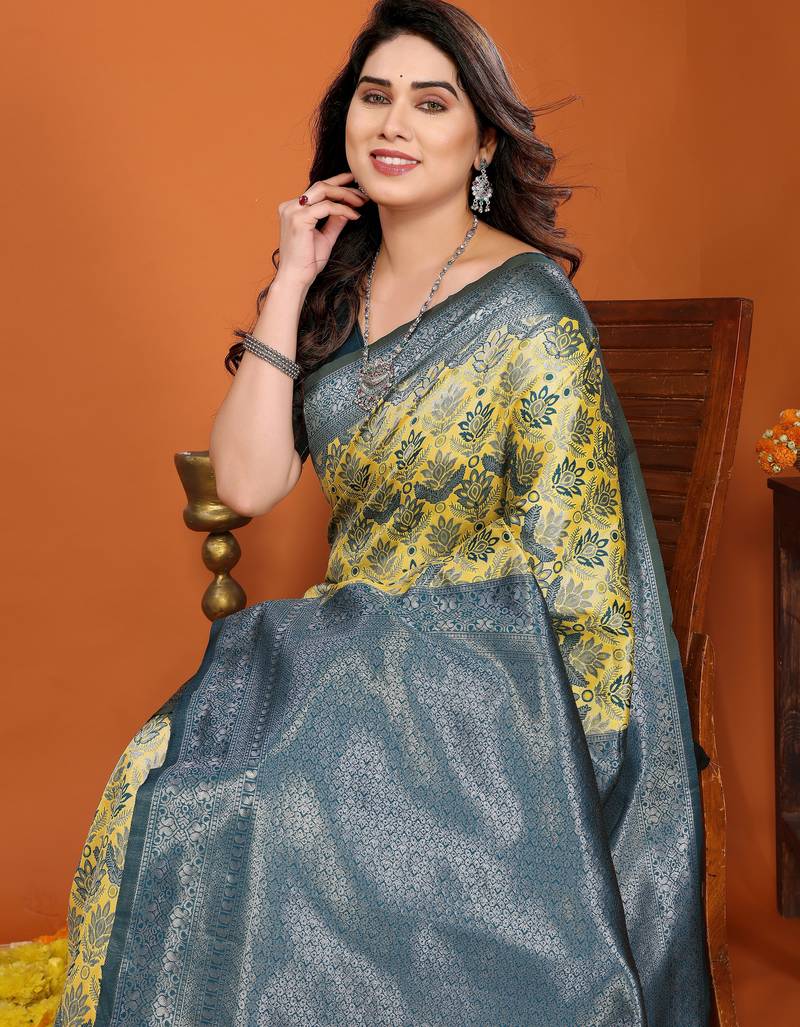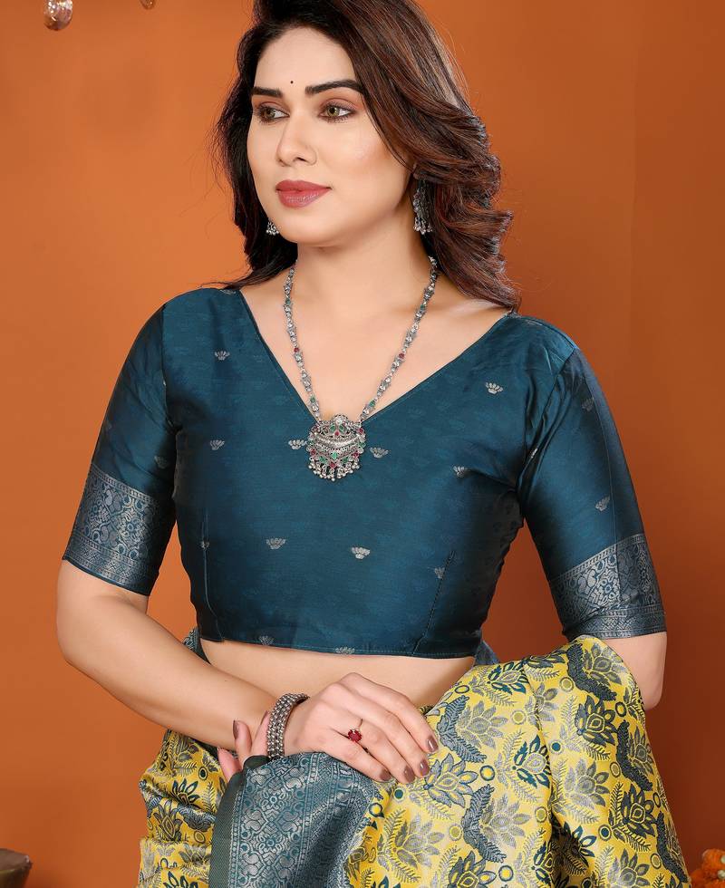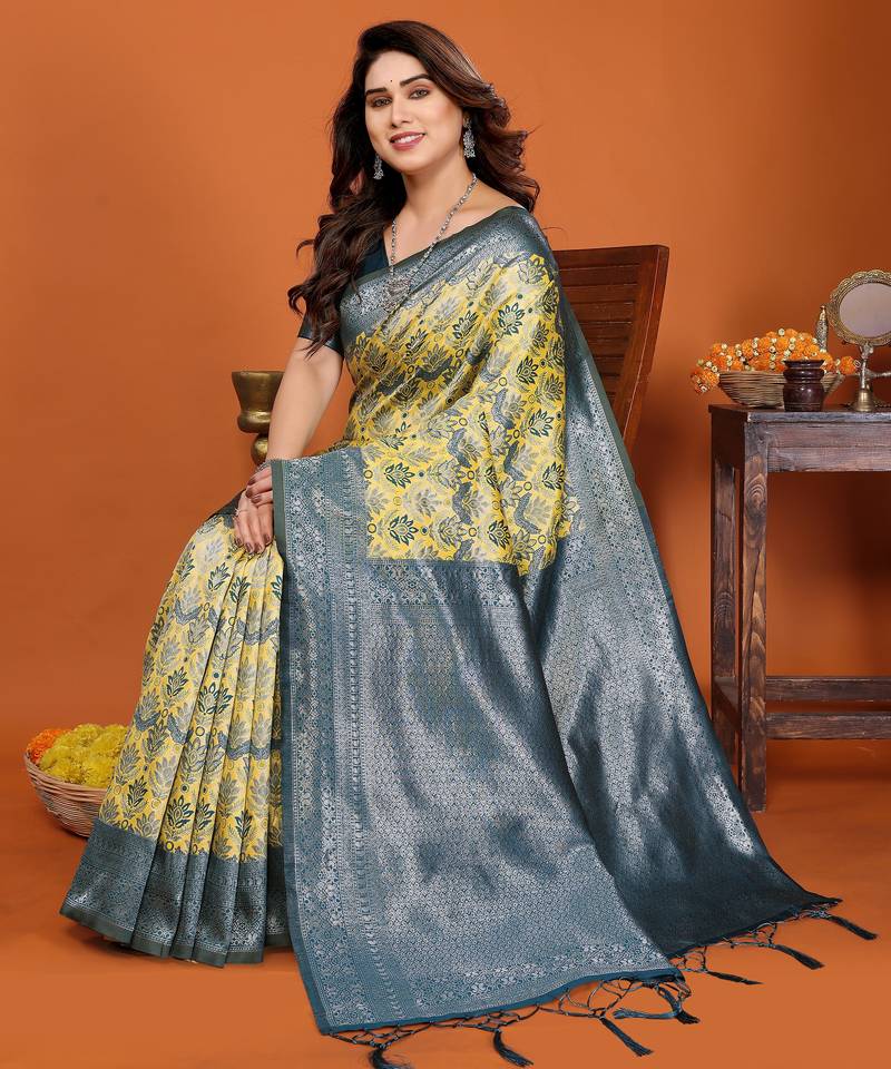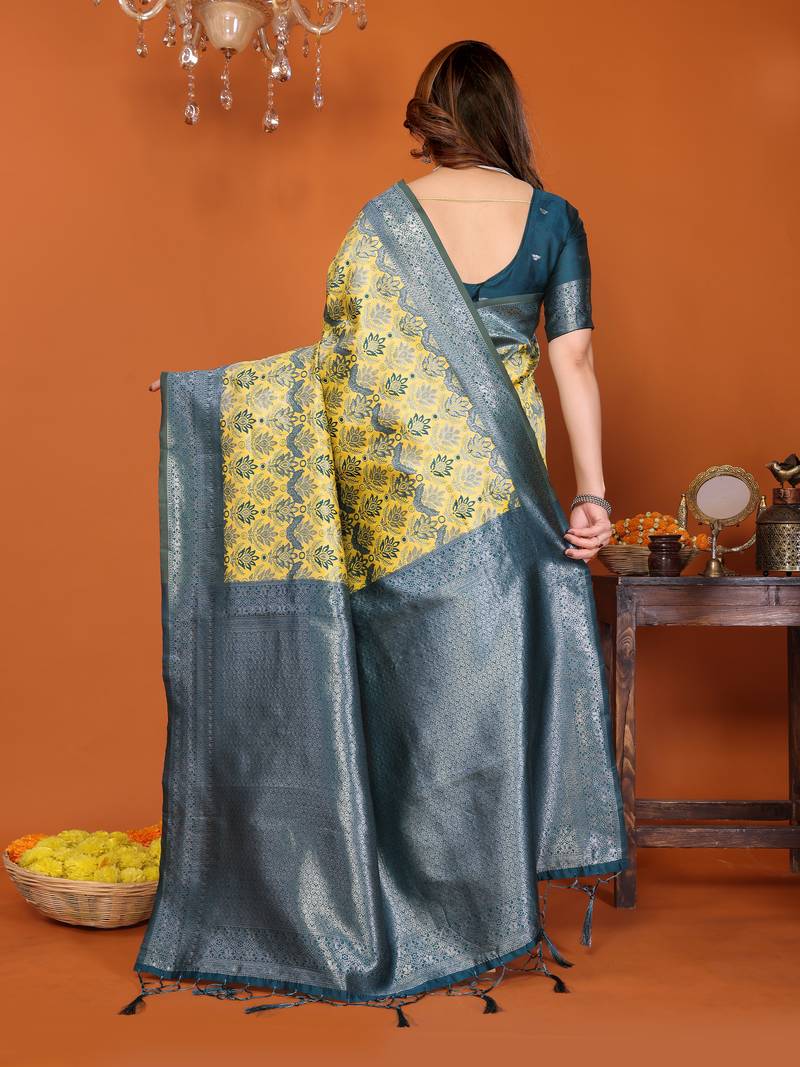Yellow morpich soft art silk blend banarasi jacuard work designer party wear saree with unstitched blouse piece