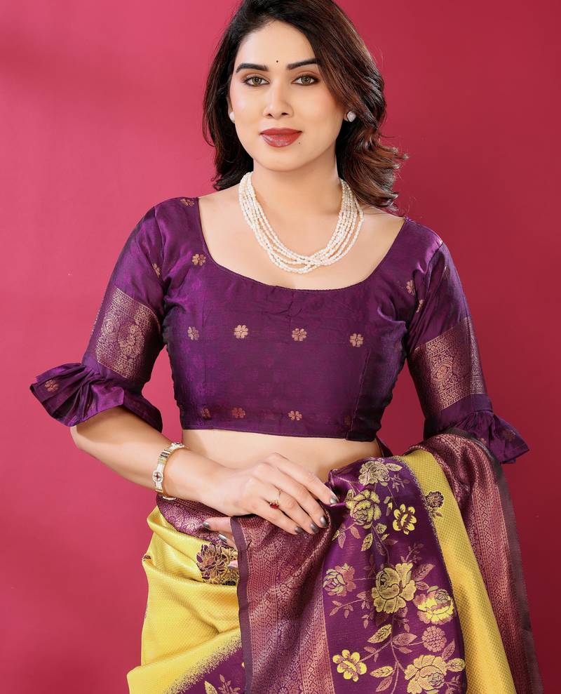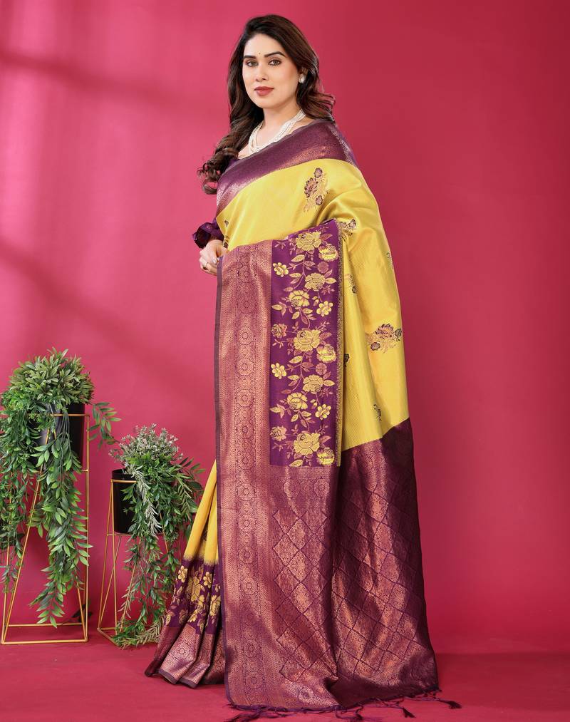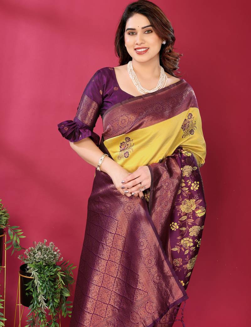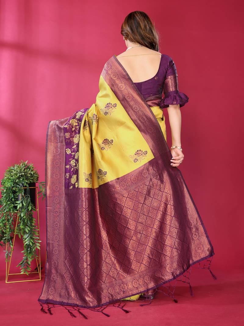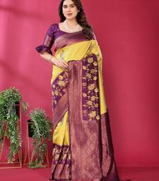 Yellpw wine soft art silk blend banarasi jacuard work designer party wear saree with unstitched blouse piece