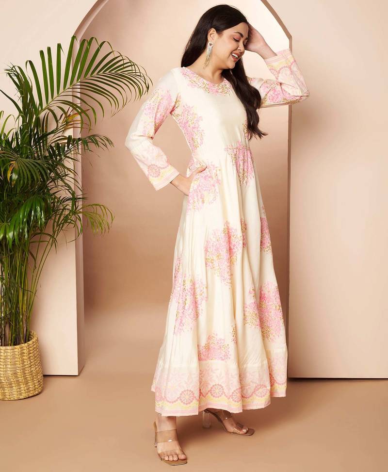 Off white printed poly silk ethnic dresses