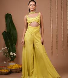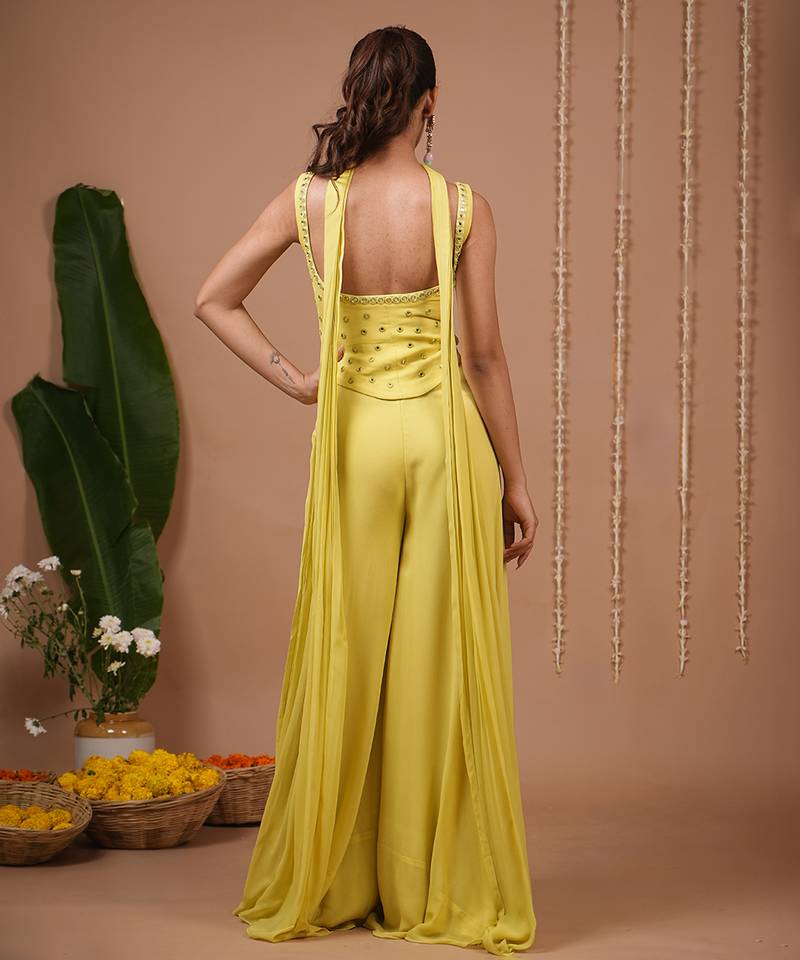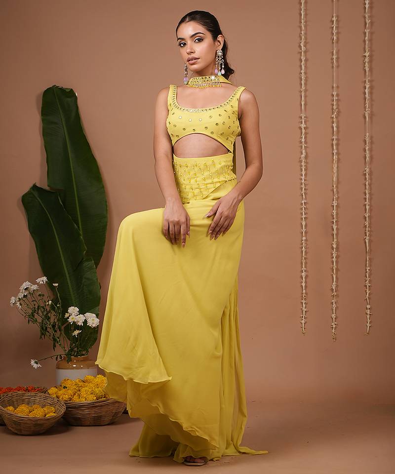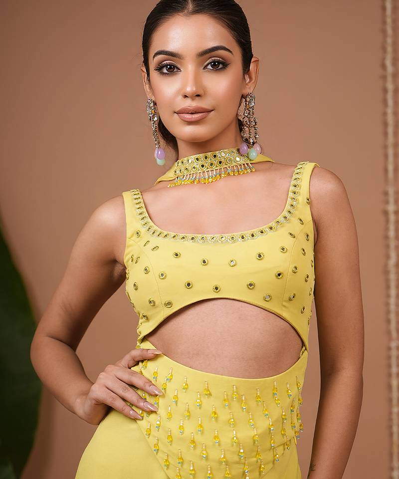 Product Description | Sleeveless, Square Neckline With Midriff Cut Out For A Bold Contemporary Look.Mirror Work & Crystal Embellishments Around Neckline, Bust, And Waist Panel..Flowing Wide Leg Palazzo Pantslightweight Matching Lime Choker Dupatta With Mirror Work, Draped Around The Neck Like A Scarf.Mirror Work + Beads On The Blouse And Waist Panel.Side Zip Closure.Top Length : 20 " , Palazzo Length: 42 " , Model Size: Model Is Wearing Xxs Size , Model Height: 5’7”