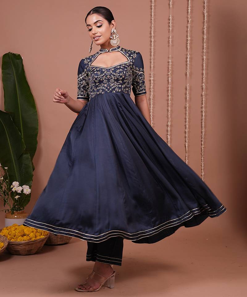 Product Description | Calf Length Flared Anarkali With Embroidered Yoke & Sleeves.Bodice Heavily Embroidered With Zari, Thread, And Mirror Floral Motifsembroidery Extends To Half Sleeves With Golden Edgingclose Square Neck Neckline With Collar Cutout Detailingstraight Pants/Palazzo In Matching Navy Base With Lace. Navy Dupatta With Golden Border And Geometric Embroidery.Side Zip Closure.Palazzo Length: 36 ,Model Size: Model Is Wearing Xxs Size, Model Height: 5’7”