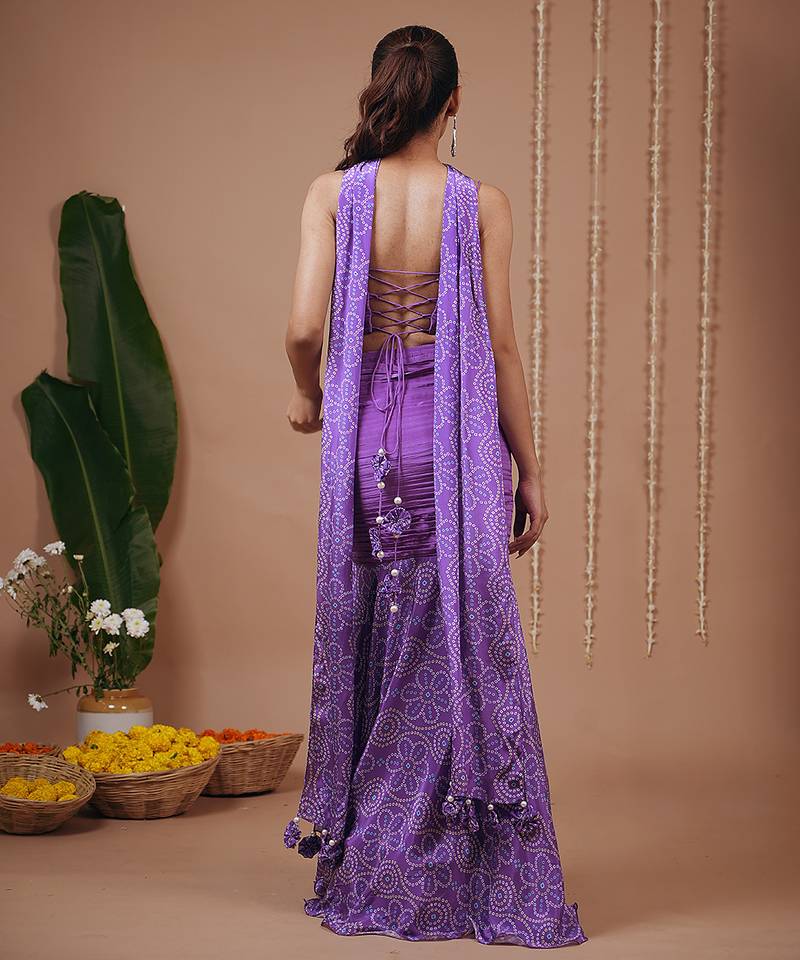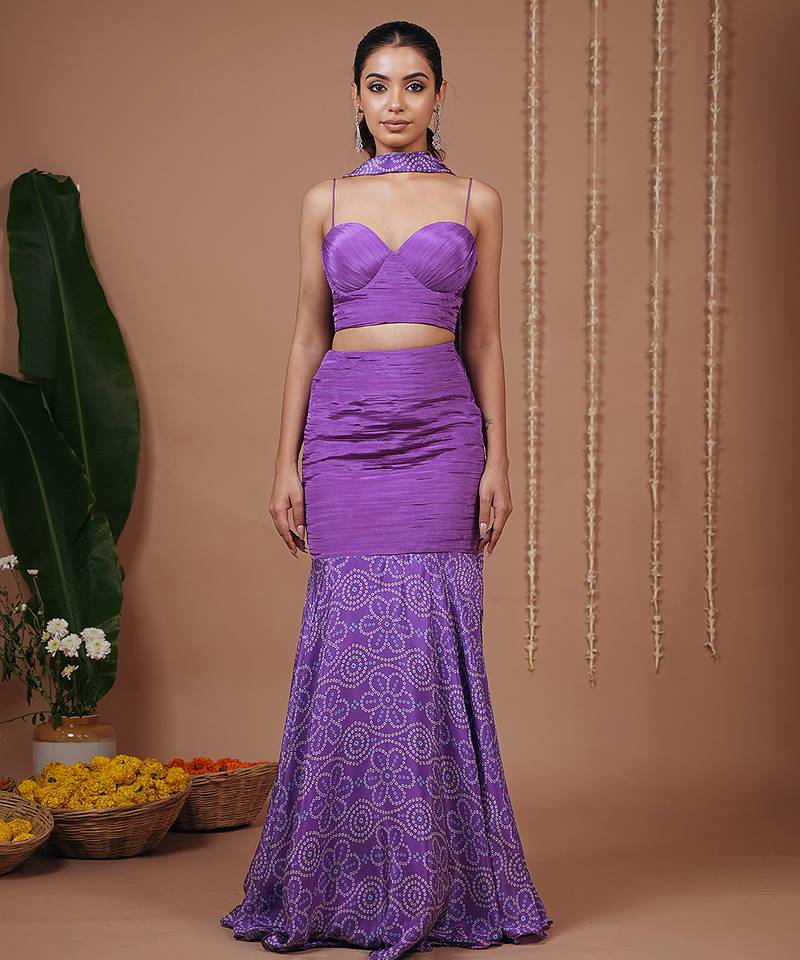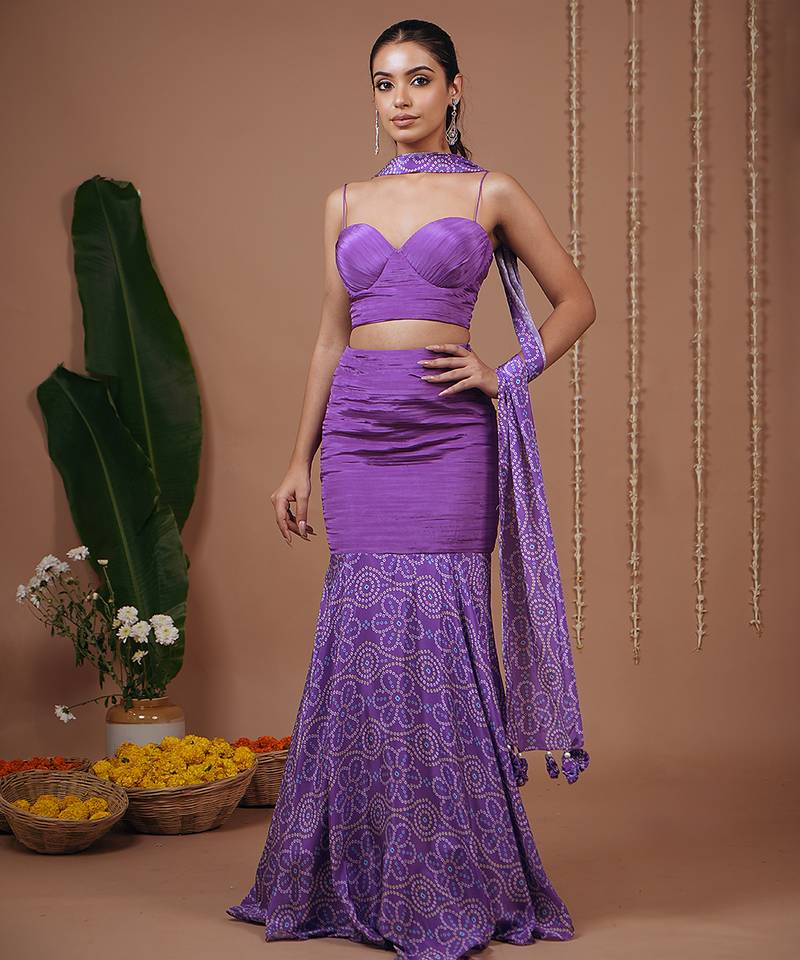 Product Description | Structured Bustier With Padded Cups.Ruched Detailing At The Bust And Waist For A Flattering Fit.Delicate Spaghetti Straps For A Contemporary Look.Mermaid Style Lehenga Skirt With Fitted Hips And Flared Hemlower Half Features Bandhani Inspired Floral Motifs.Slim, Narrow Dupatta Styled Around The Neck (Scarf Like)Sheer With Light Embellishment, Adding Elegance Without Heaviness.Side Zip Closure.Skirt Length: 44 ,Model Size: Model Is Wearing Xxs Size , Model Height: 5’7”