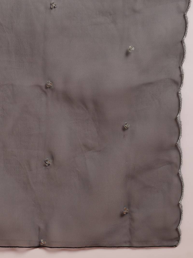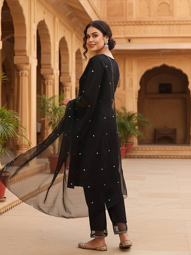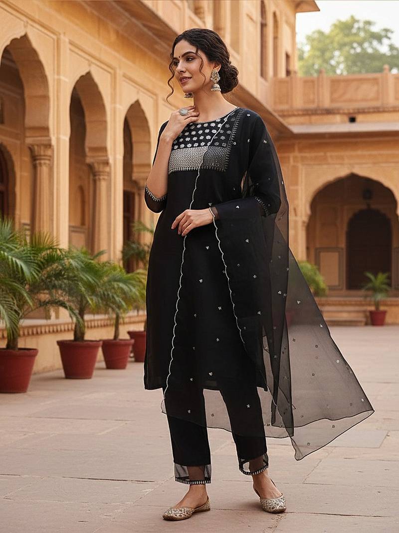 Black color embroidered poly silk styles kurta trouser with dupatta