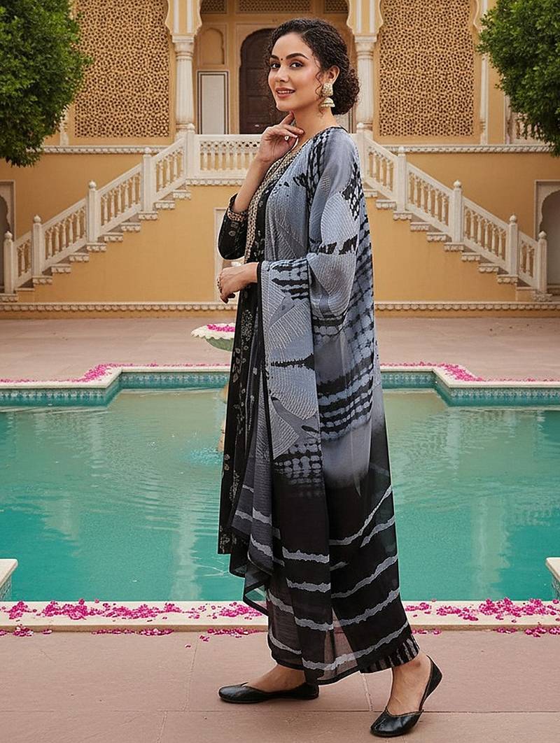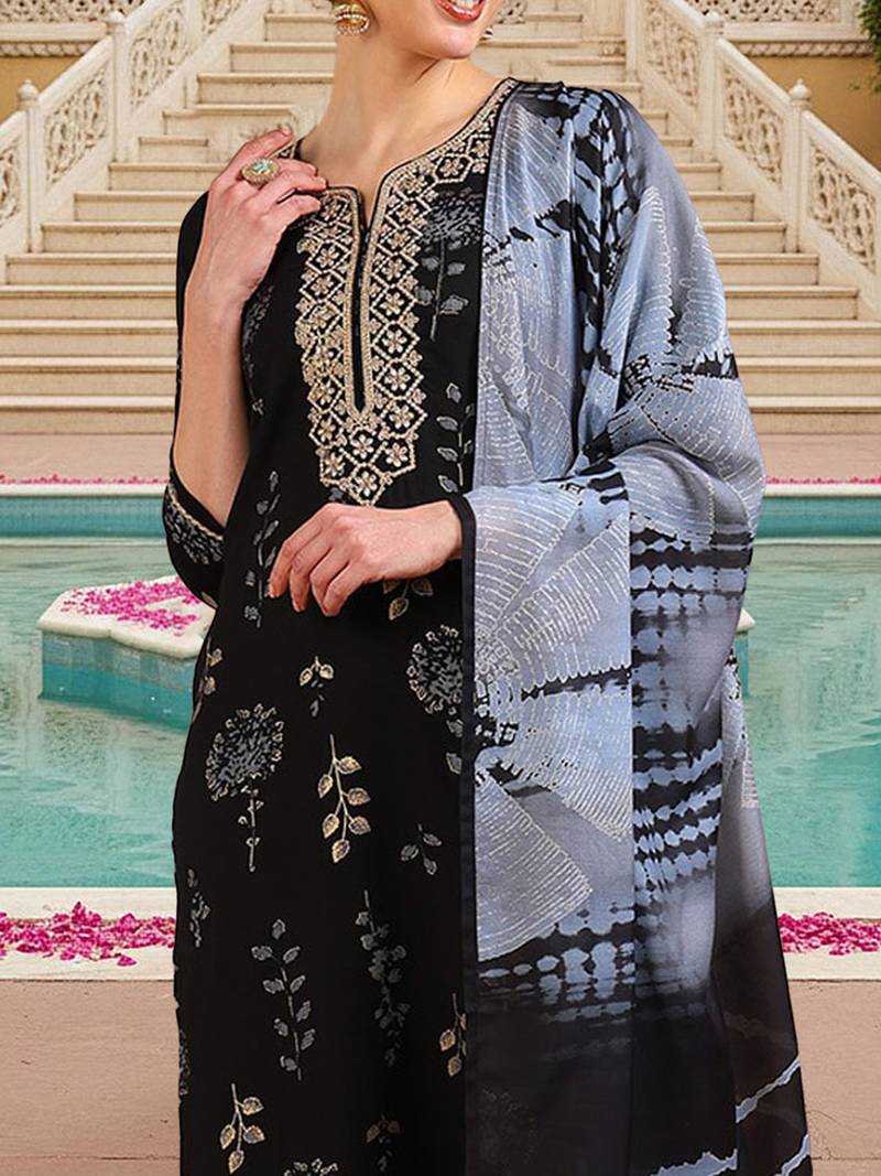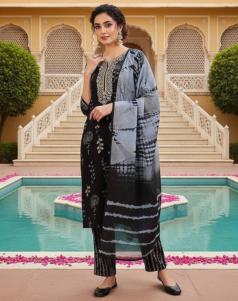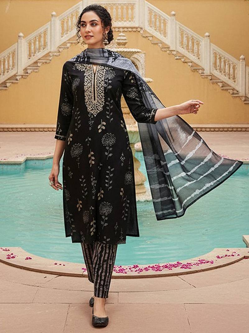 Product Name | Women Black Cotton Blend Floral Yoke Design Straight Kurta Trousers With Dupatta | |