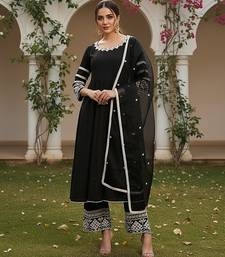 Women black silk blend solid embroidered anarkali kurta palazzos with dupatta