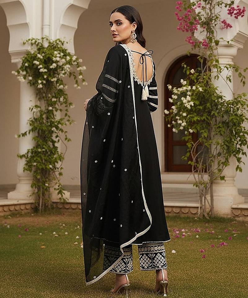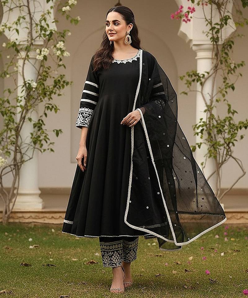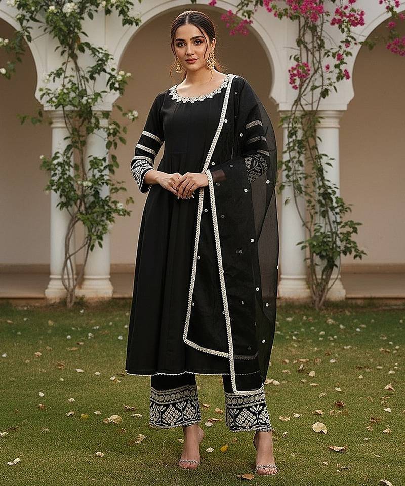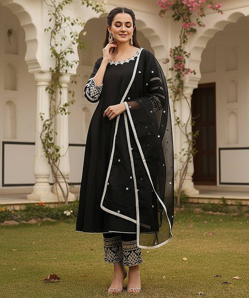 Product Name | Women Black Silk Blend Solid Embroidered Anarkali Kurta Palazzos With Dupatta | |