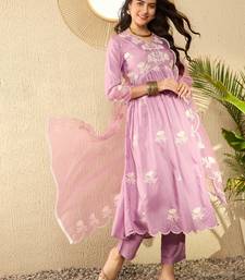 Women lavender silk blend solid embroidered a-line kurta trouser with dupatta