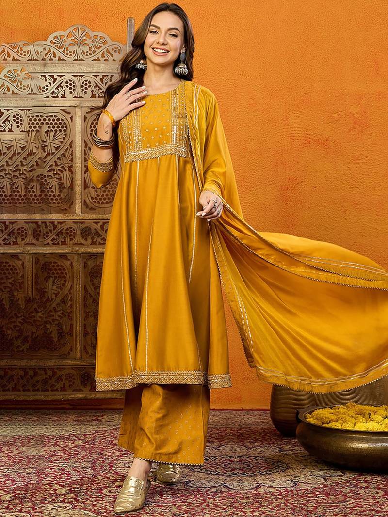 | Product Name | Women Mustard Silk Blend Solid Embroidered Anarkali Kurta Palazzo With Dupatta | |
