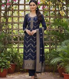 Women navy blue silk blend ethnic motifs woven design straight kurta trousers with dupatta