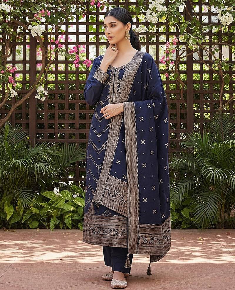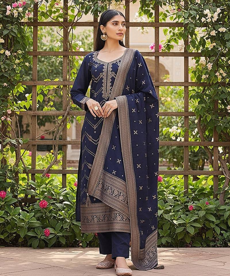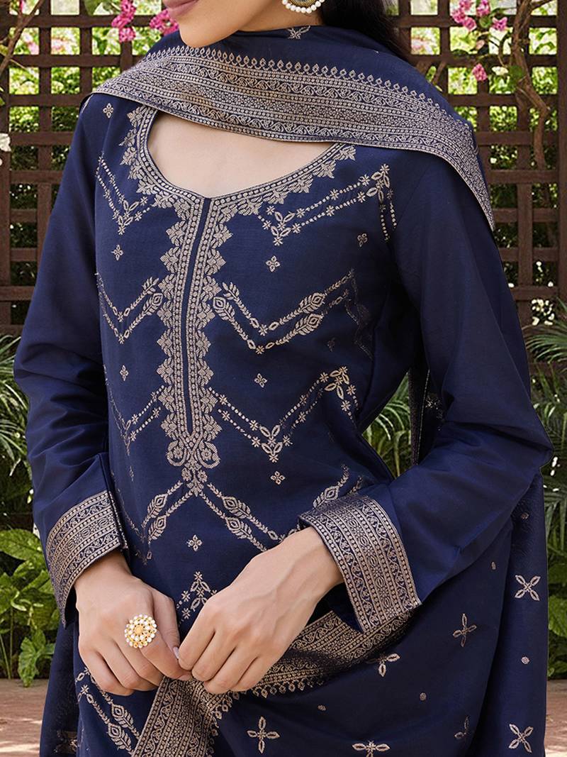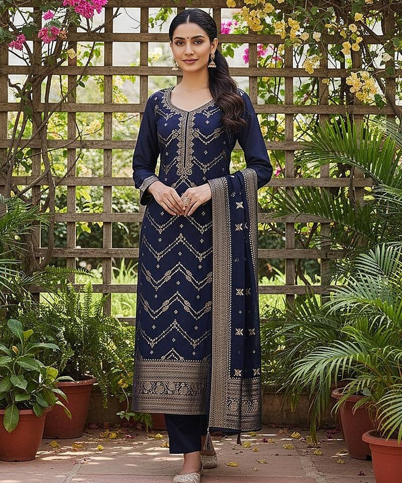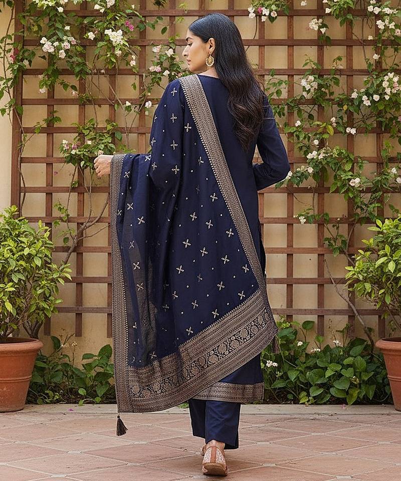 Product Name | Women Navy Blue Silk Blend Ethnic Motifs Woven Design Straight Kurta Trousers With Dupatta | |