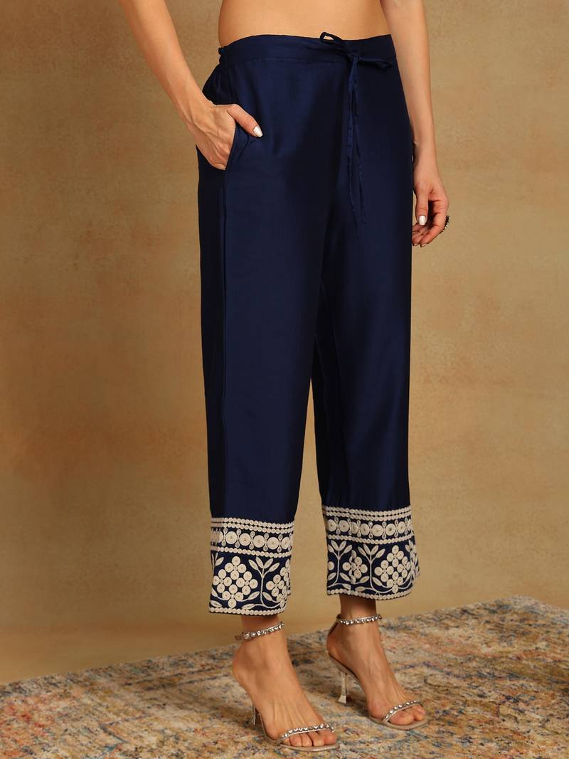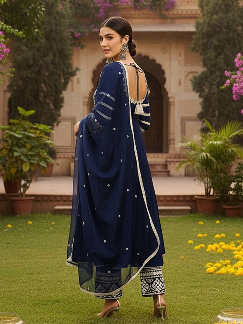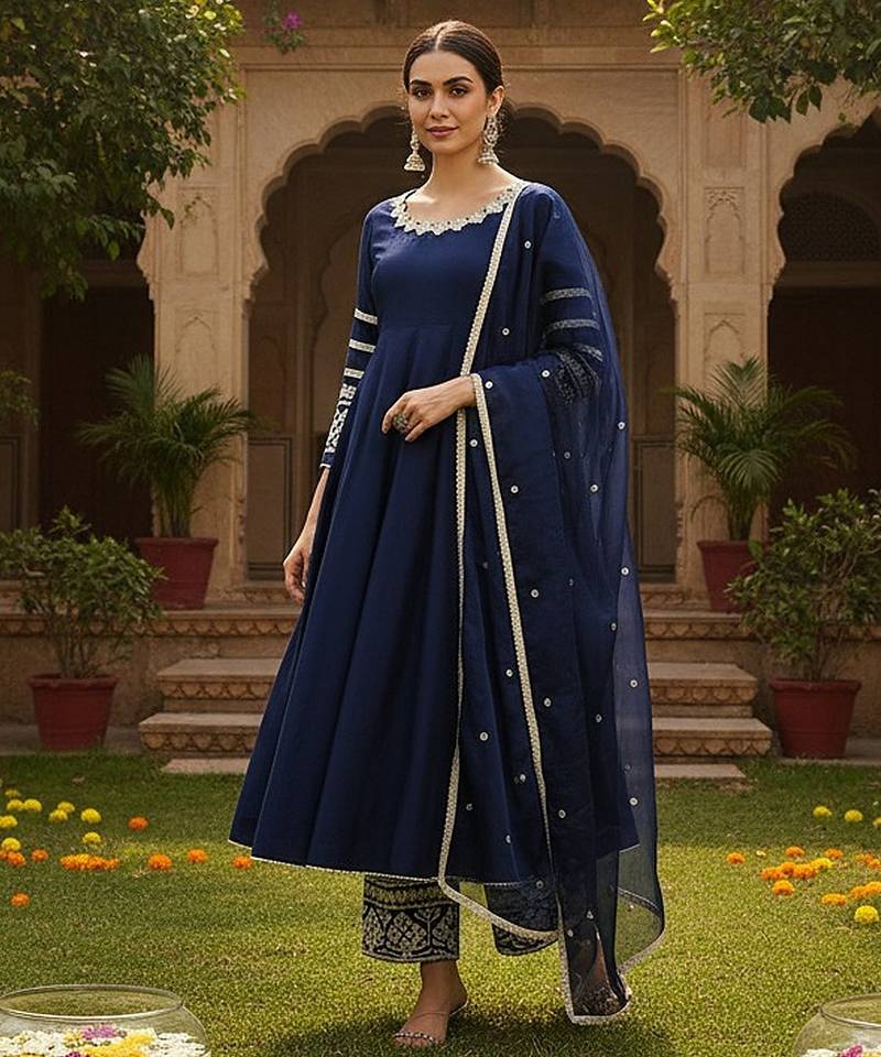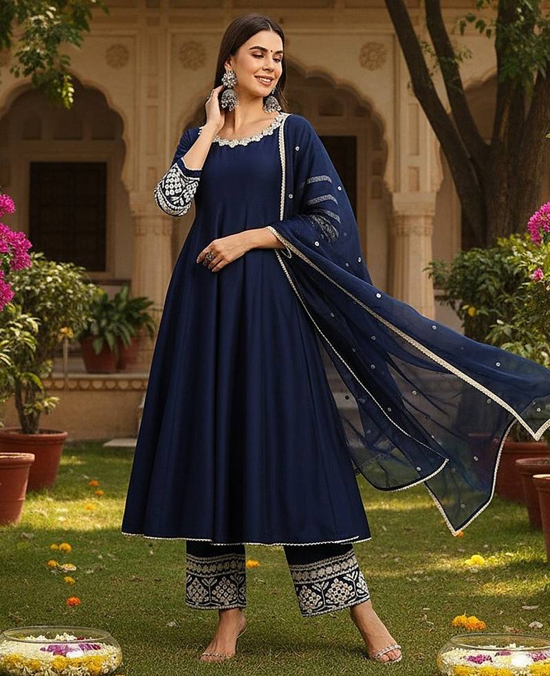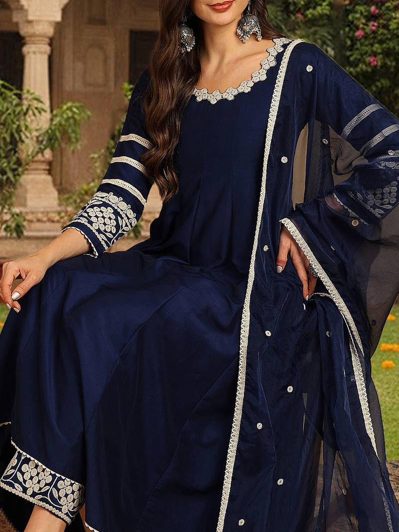 Product Name | Women Navy Blue Silk Blend Solid Embroidered Anarkali Kurta Palazzos With Dupatta | |