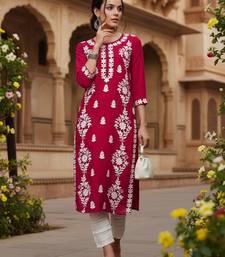 Women red rayon blend solid embroidered chikankari straight only kurta