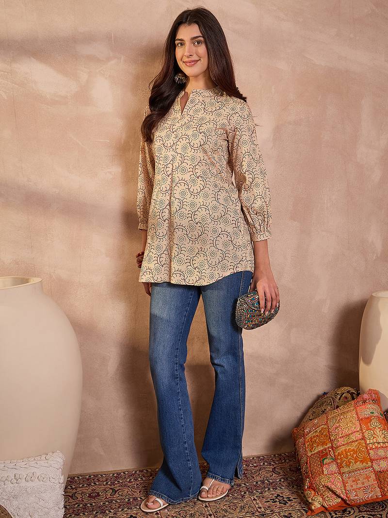 Women beige ethnic motifs printed cotton tops