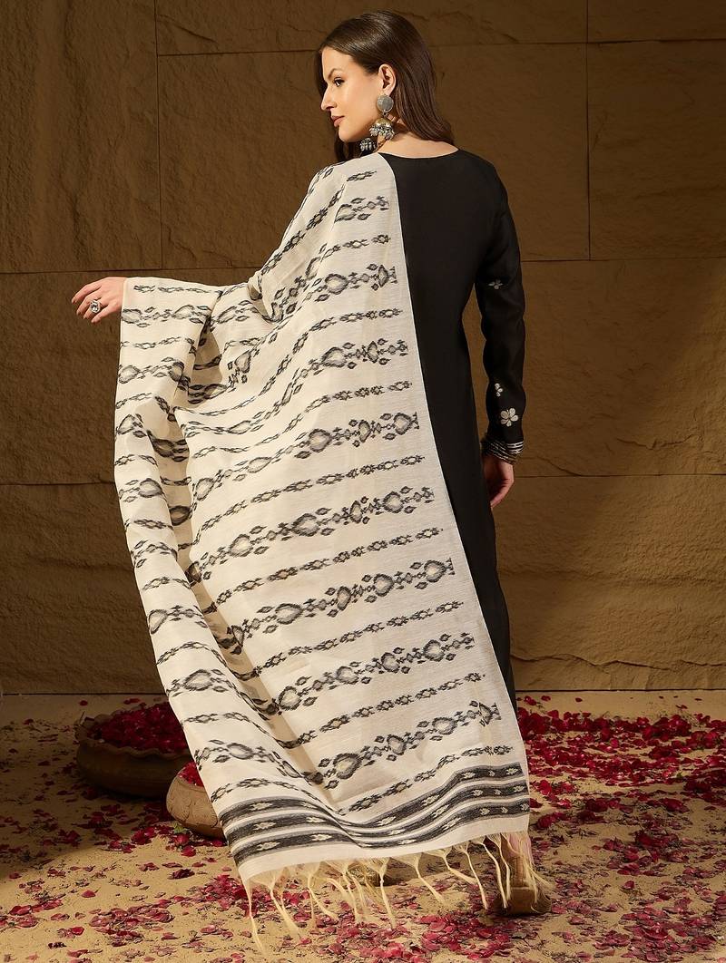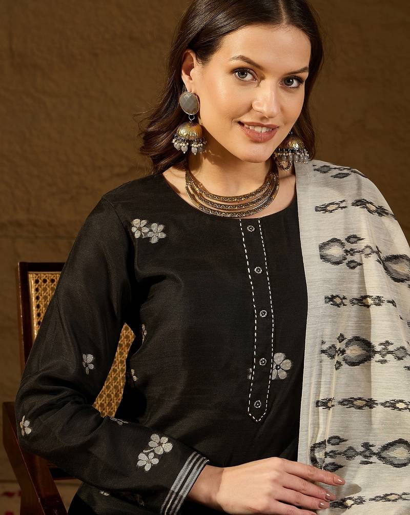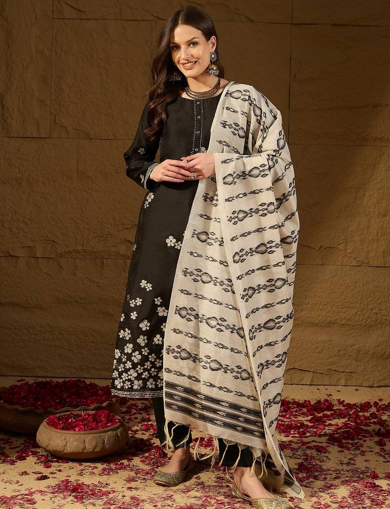 Women black poly chanderi solid embroidered straight kurta bottom and dupatta