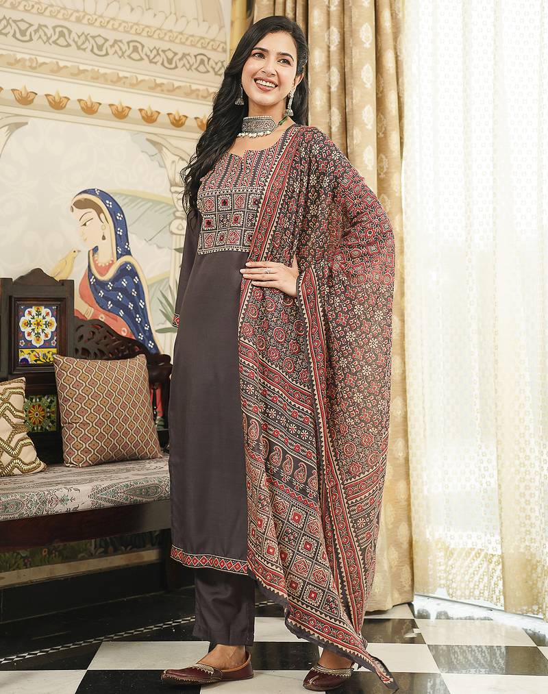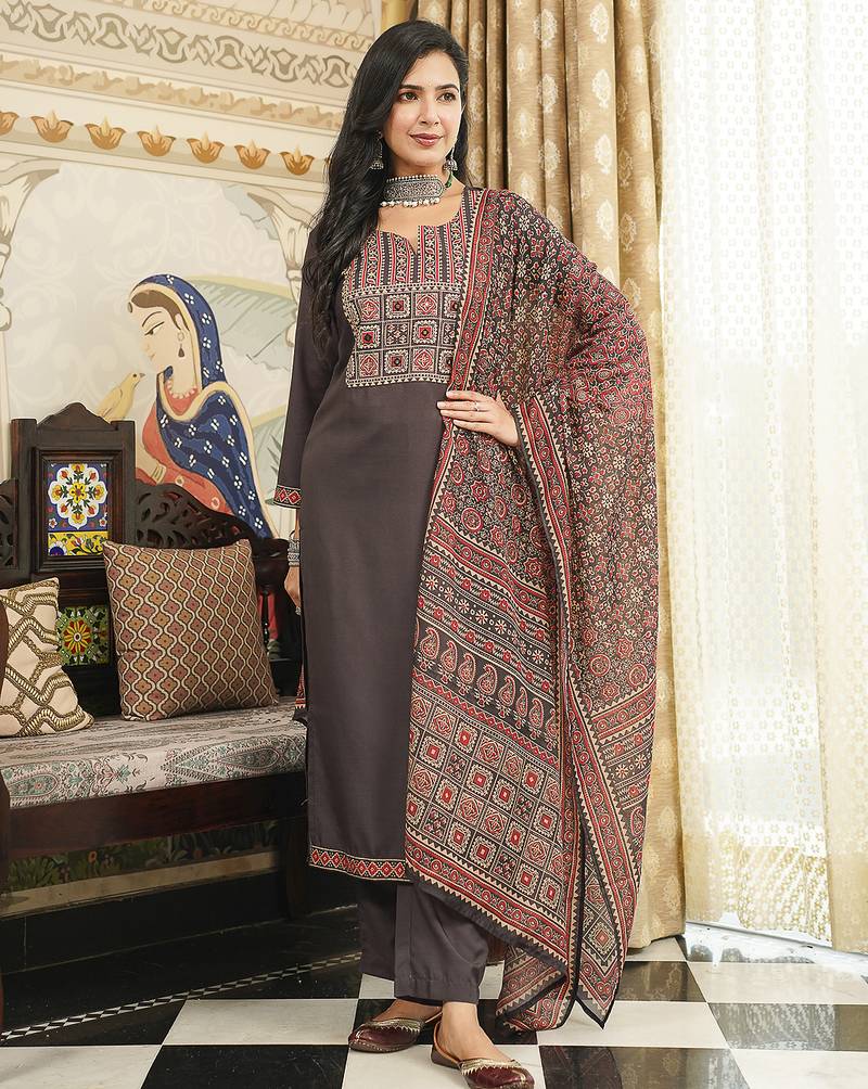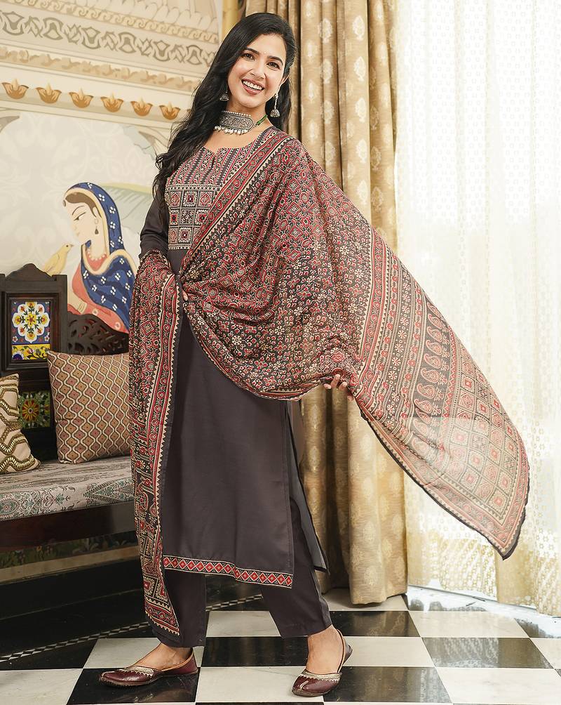 Product Name | Women Black Rayon Blend Ajrakh Printed Straight Kurta Trousers With Dupatta | |