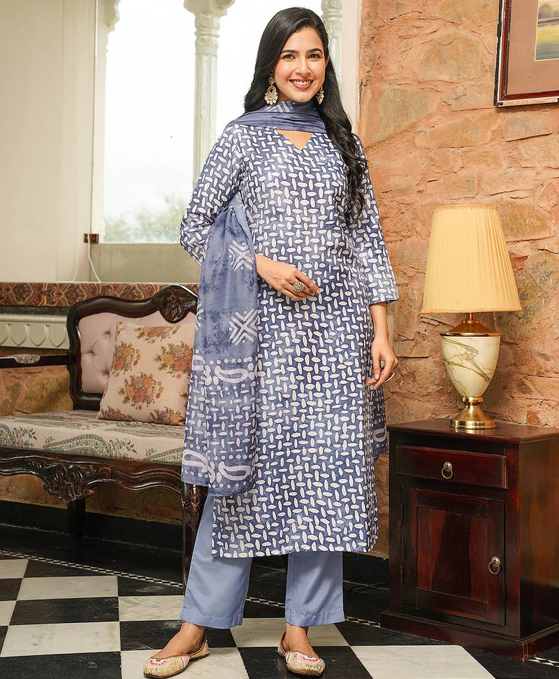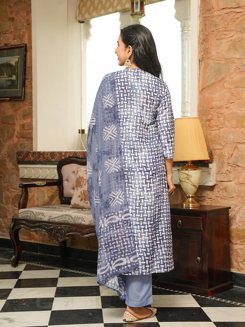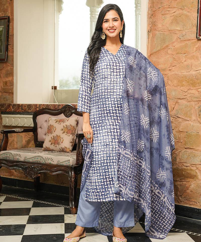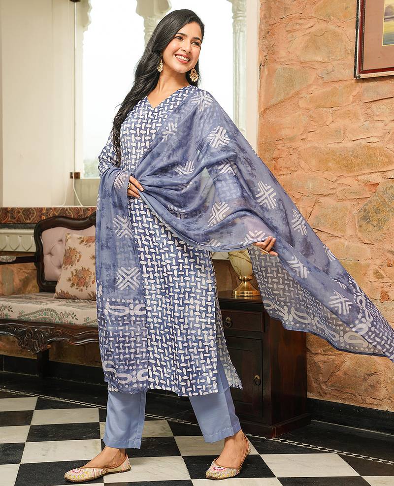 Product Name | Women Blue Rayon Blend Batik Printed Straight Kurta Trousers With Dupatta | |