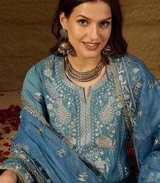 Women blue silk blend solid embroidered straight kurta trousers with dupatta