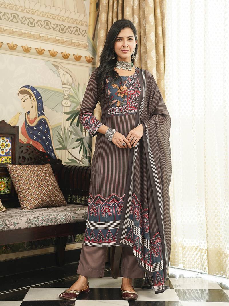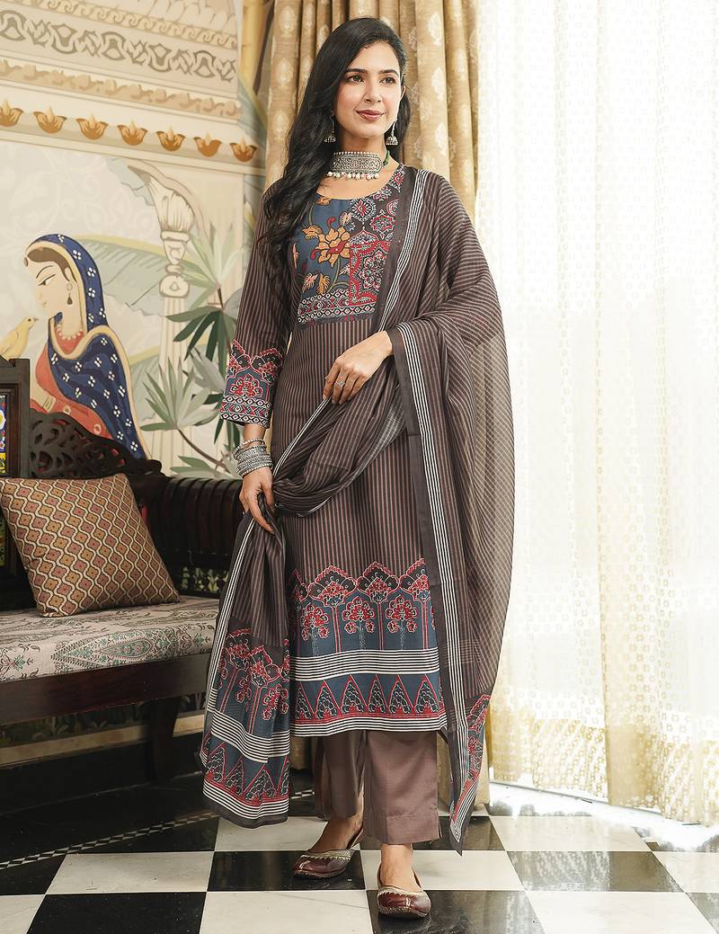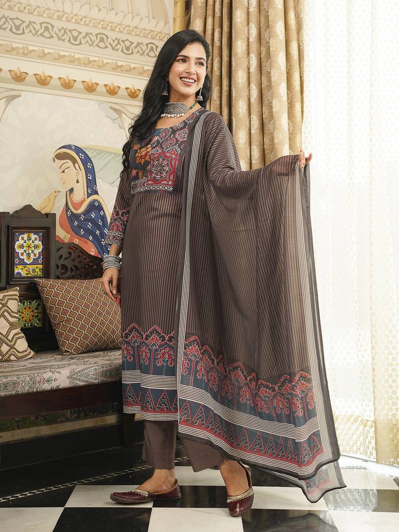 Product Name | Women Brown Rayon Blend Ethnic Motifs Printed Straight Kurta Trousers With Dupatta | |