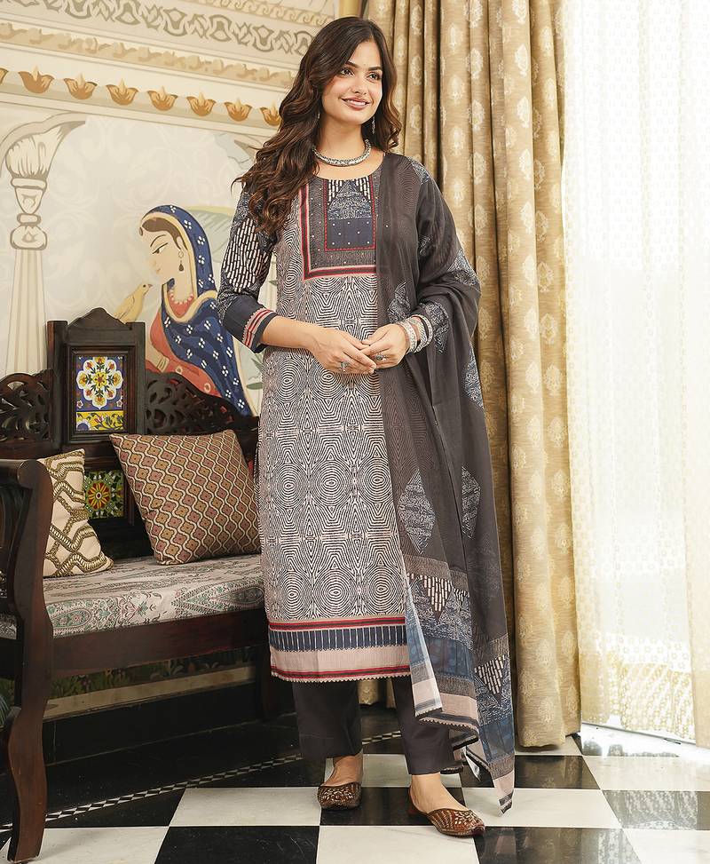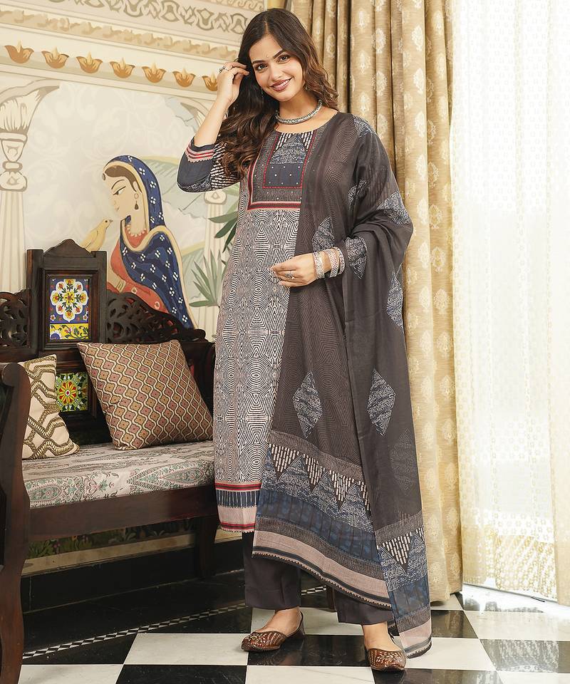 Product Name | Women Cream Rayon Blend Geometric Printed Straight Kurta Trousers With Dupatta | |