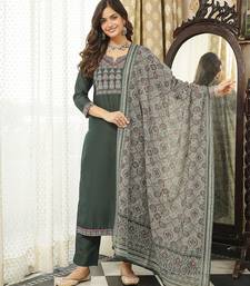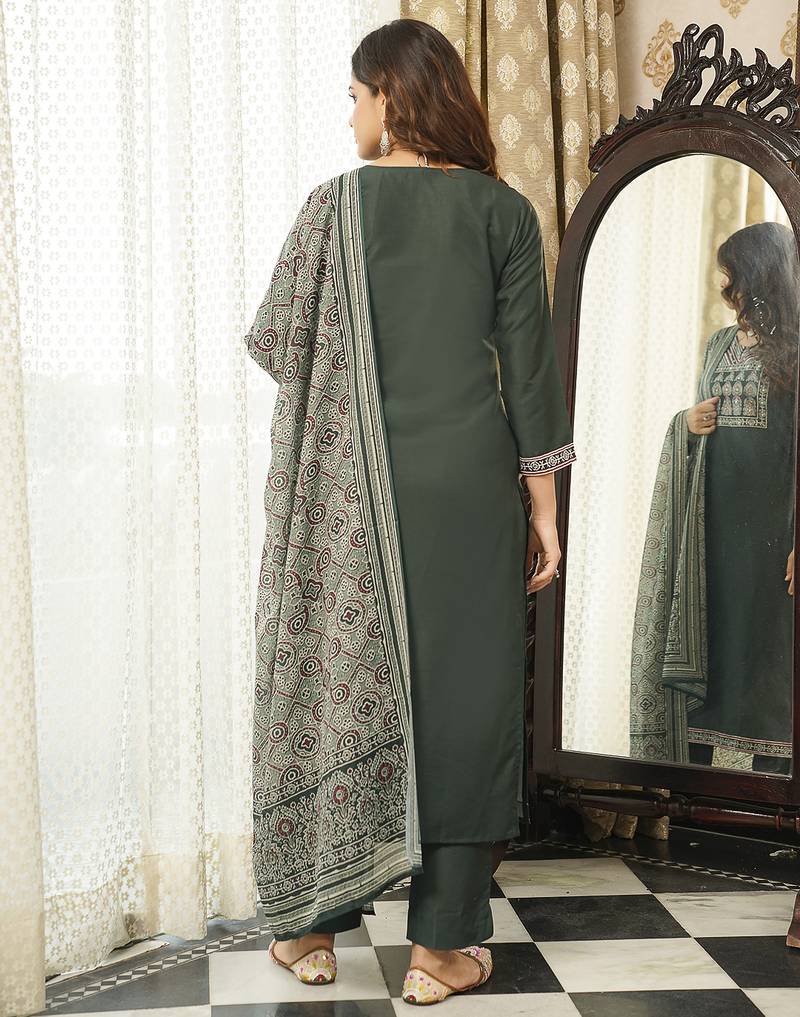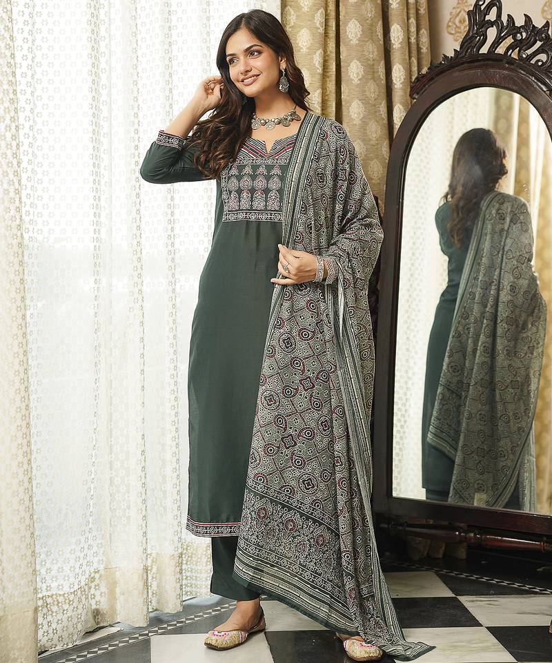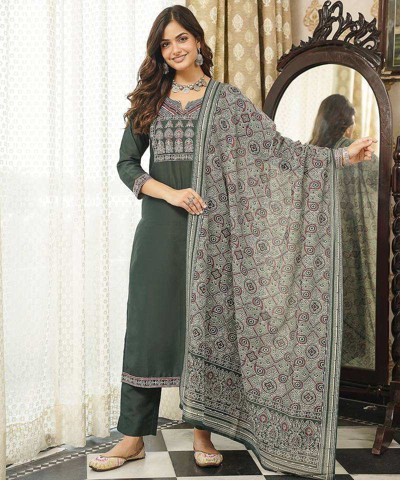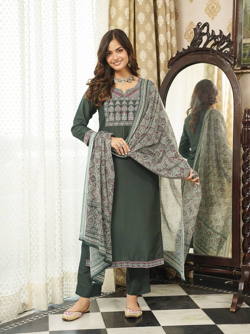 Product Name | Women Green Rayon Blend Ajrakh Printed Straight Kurta Trousers With Dupatta | |