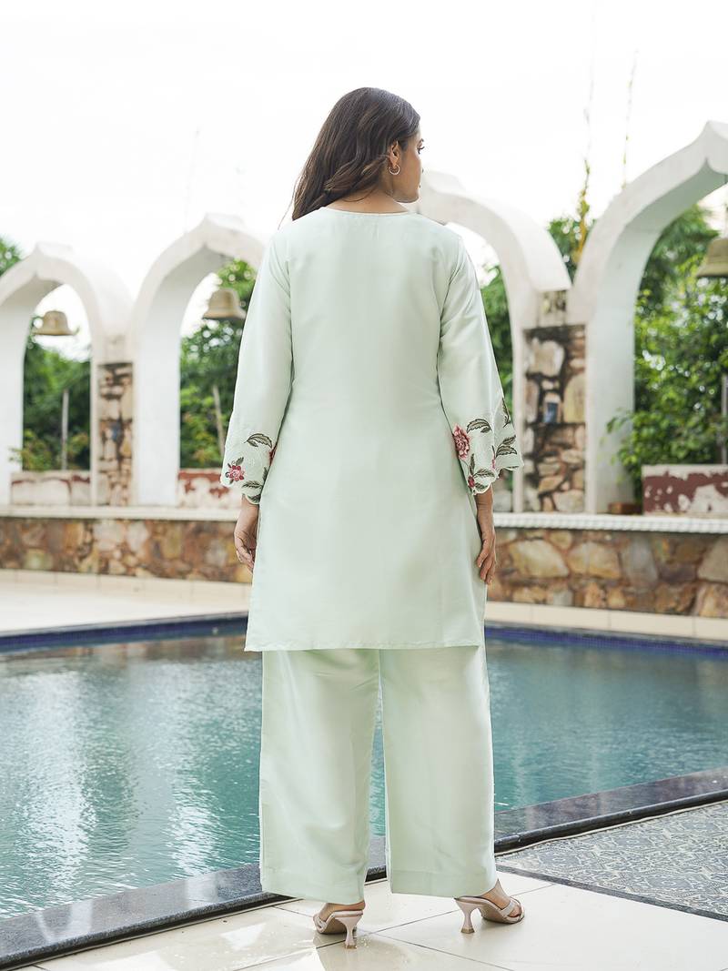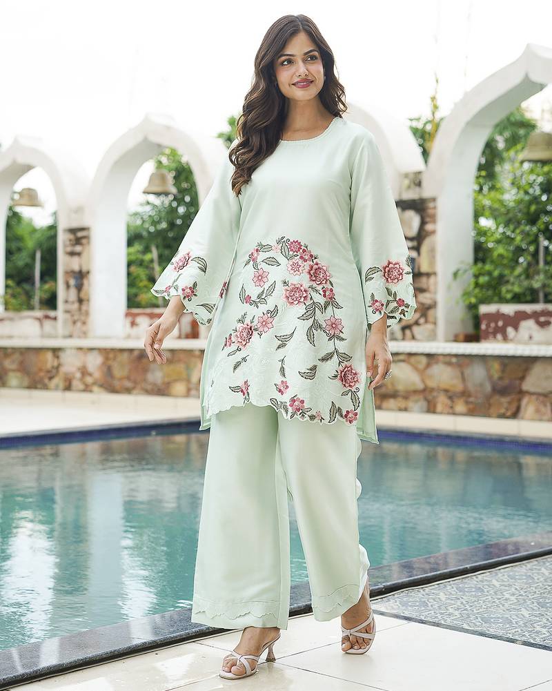 Product Name | Women Green Silk Blend Solid Embroidered Coord Sets | |