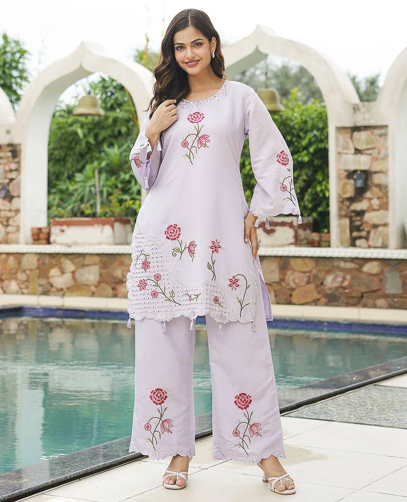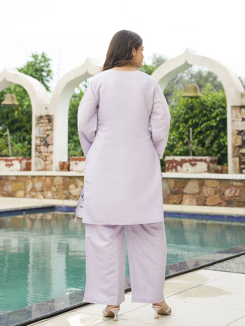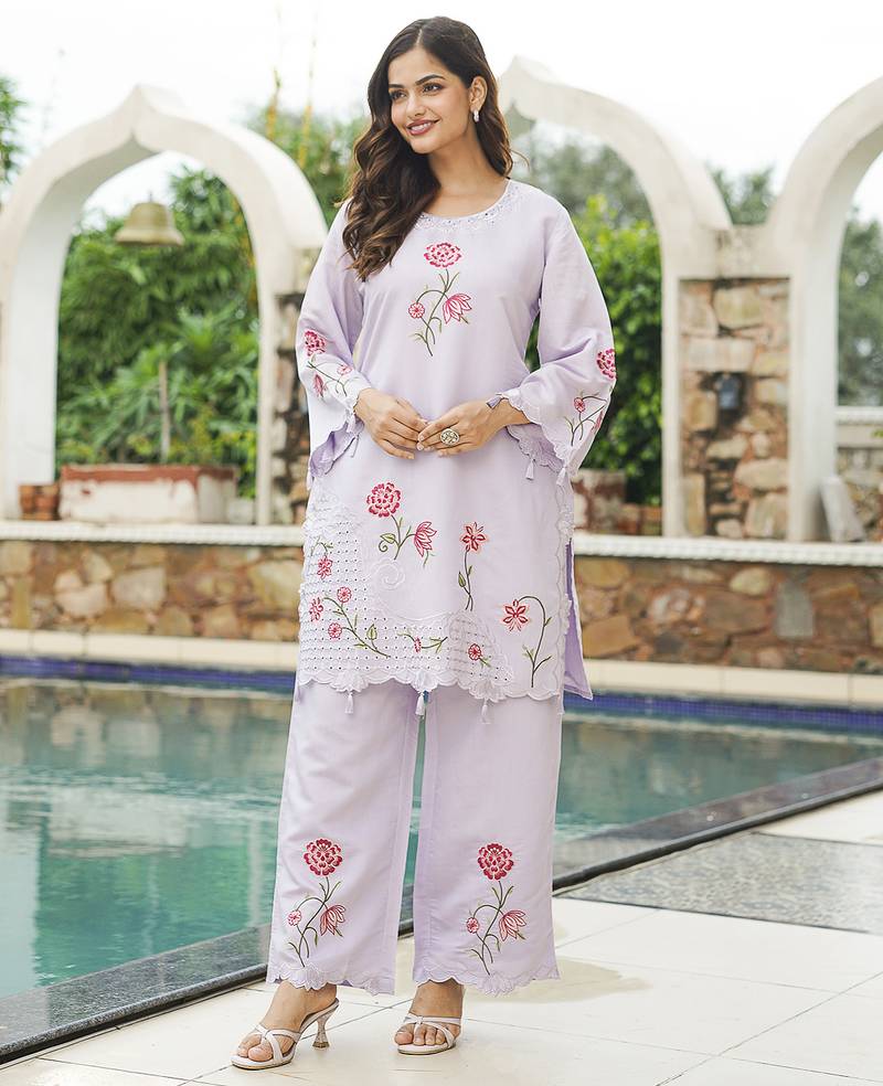 Product Name | Women Lavender Silk Blend Solid Embroidered Coord Sets | |
