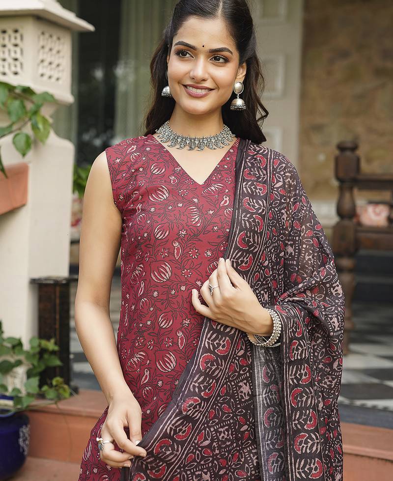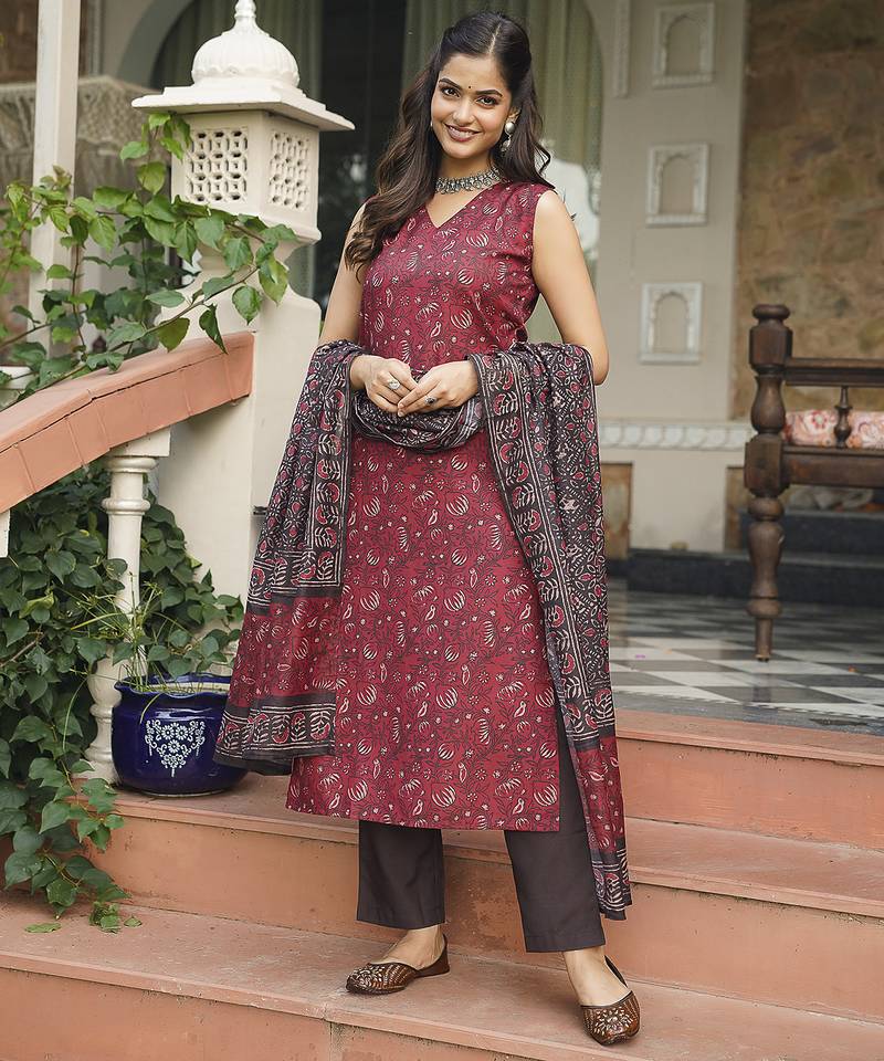 Product Name | Women Maroon Rayon Blend Floral Printed Straight Kurta Trousers With Dupatta | |