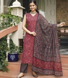 Women maroon rayon blend floral printed straight kurta trousers with dupatta