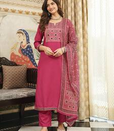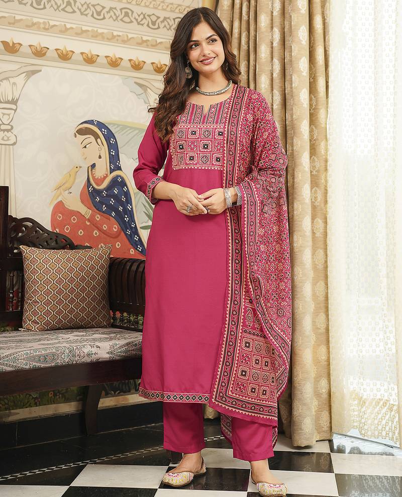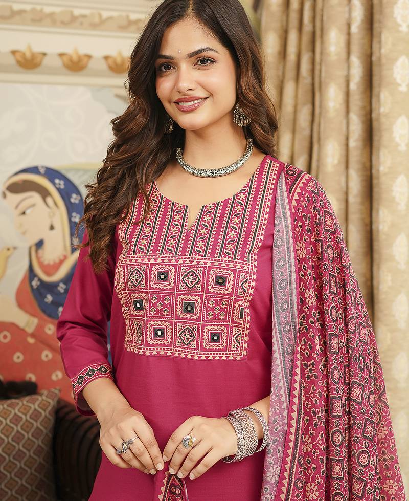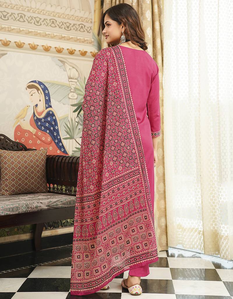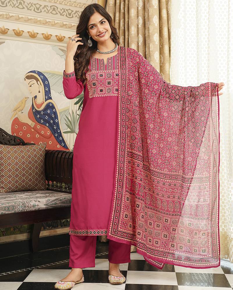 Product Name | Women Pink Rayon Blend Ajrakh Printed Straight Kurta Trousers With Dupatta | |