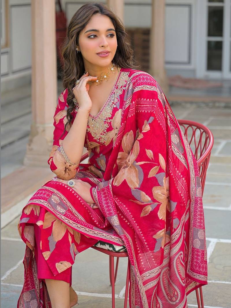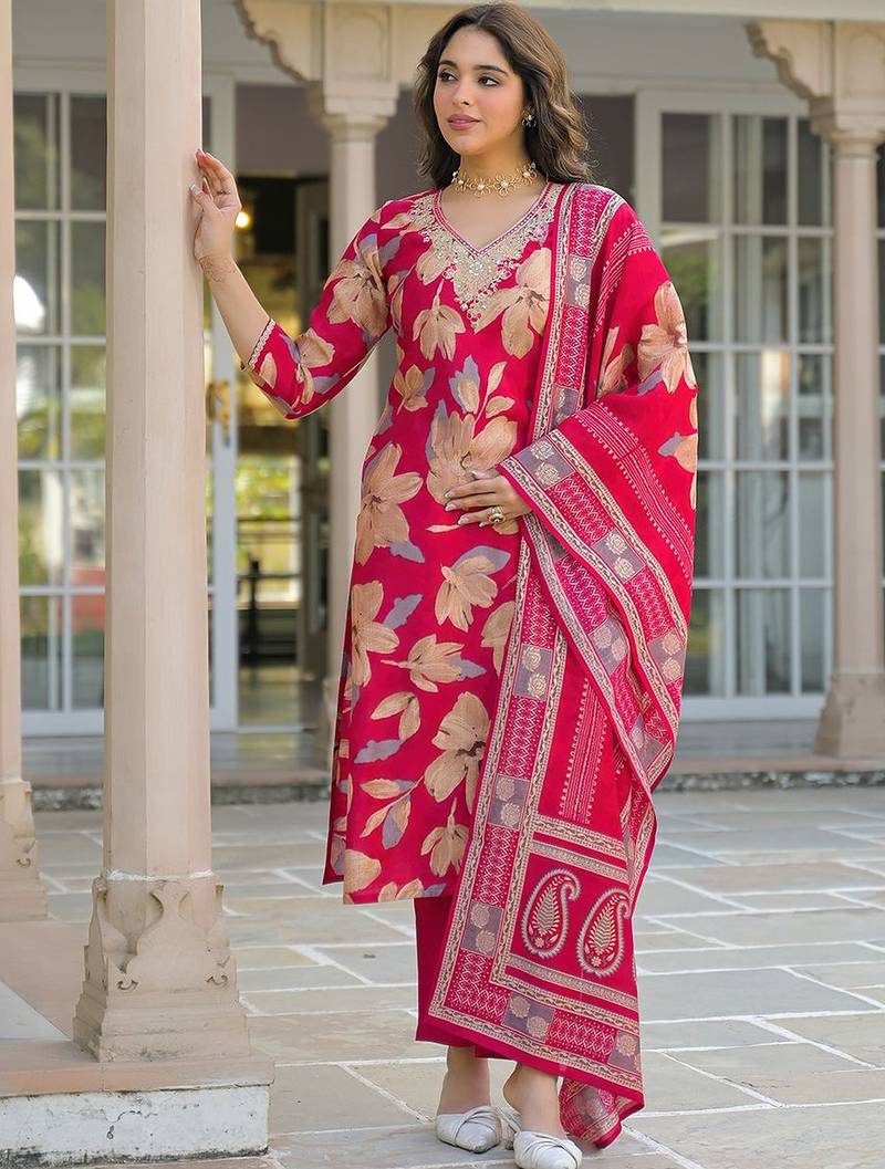 | Product Name | Women Pink Viscose Floral Embroidered Straight Kurta Trousers With Dupatta | |