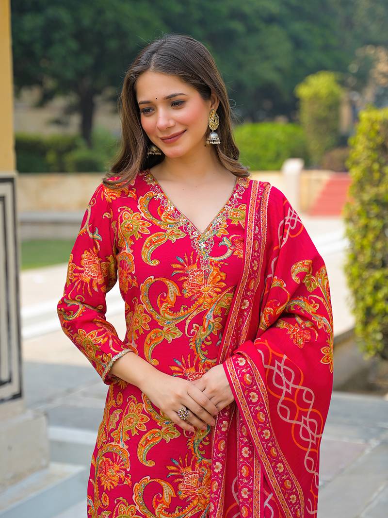 Women pink viscose rayon floral printed straight kurta trousers with dupatta