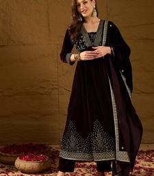 Women purple velvet floral printed anarkali kurta trousers with dupatta