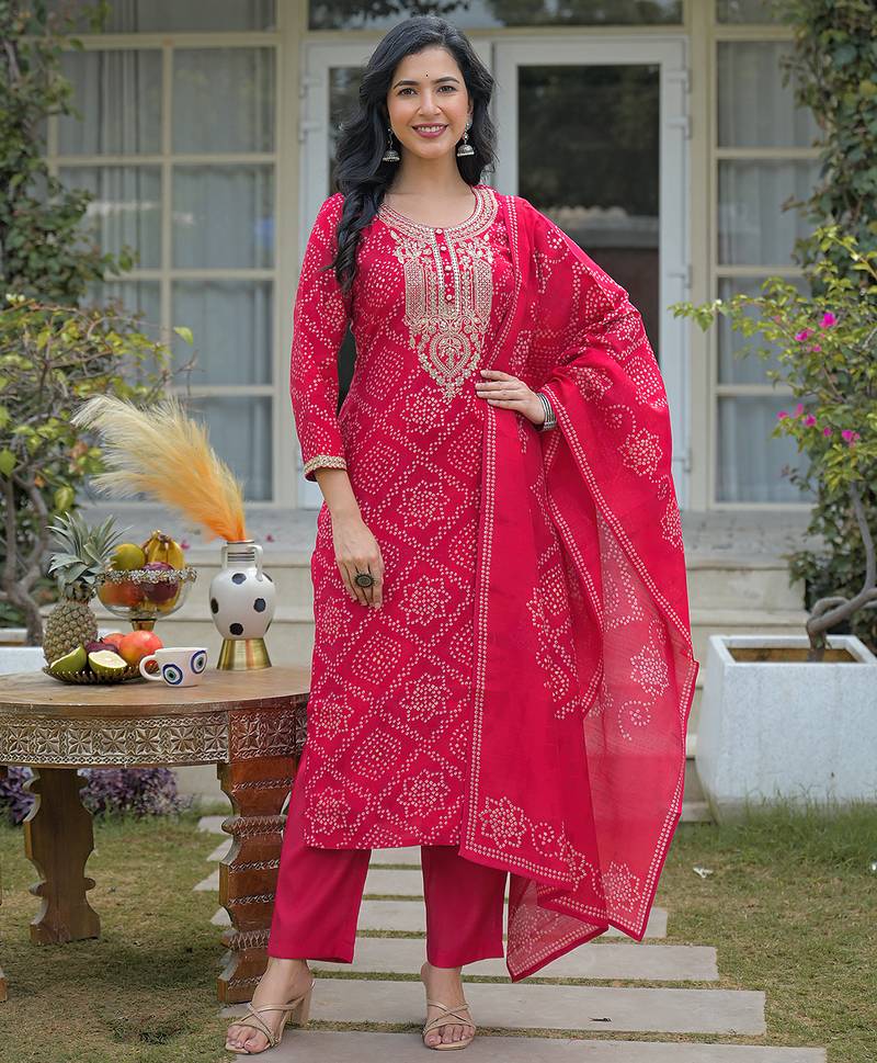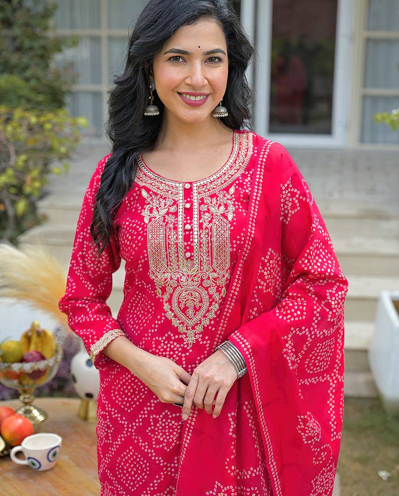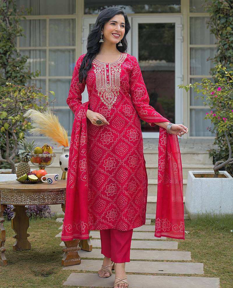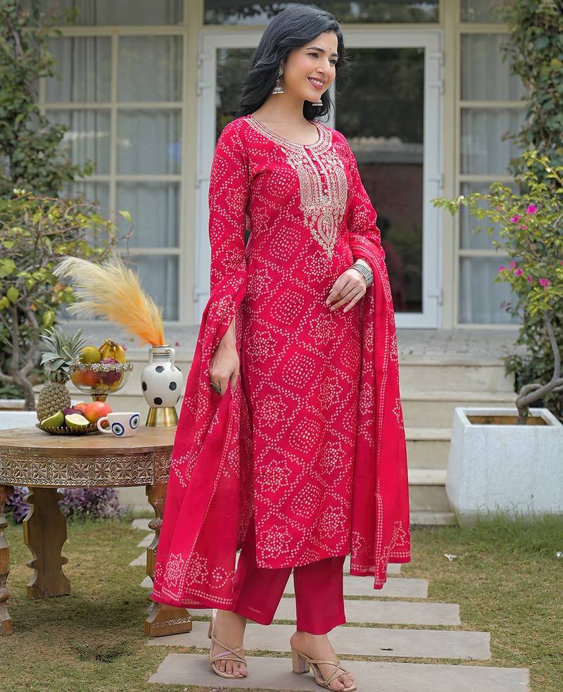 | Product Name | Women Red Silk Blend Bandhani Embroidered Straight Kurta Trousers With Dupatta | |