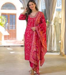 Women red viscose ethnic motifs printed straight kurta trousers with dupatta