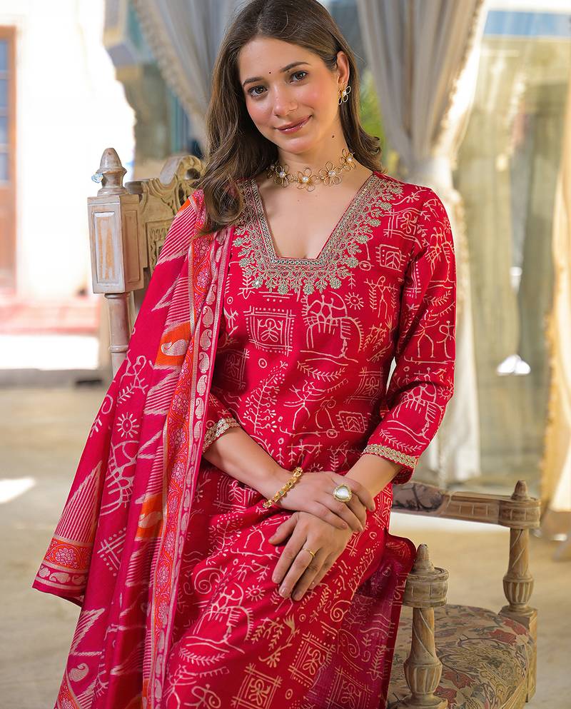 Ahika Is A Women’s Ethnic Wear Brand Known For Its Ready To Wear Kurta Suit Sets That Blend Traditional Indian Design With Comfortable, Everyday Fabrics Like Viscose. The Brand Offers Vibrant Red Color And Tasteful Styles That Make These Outfits Versatile For Daily Casual Wear, Festive Occasions, And Family Gatherings. Most Sets Are Three Piece Ensembles — A Kurta Paired With A Matching Trousers And A Coordinating Dupatta — Giving You A Complete Look Straight Out Of The Wardrobe.