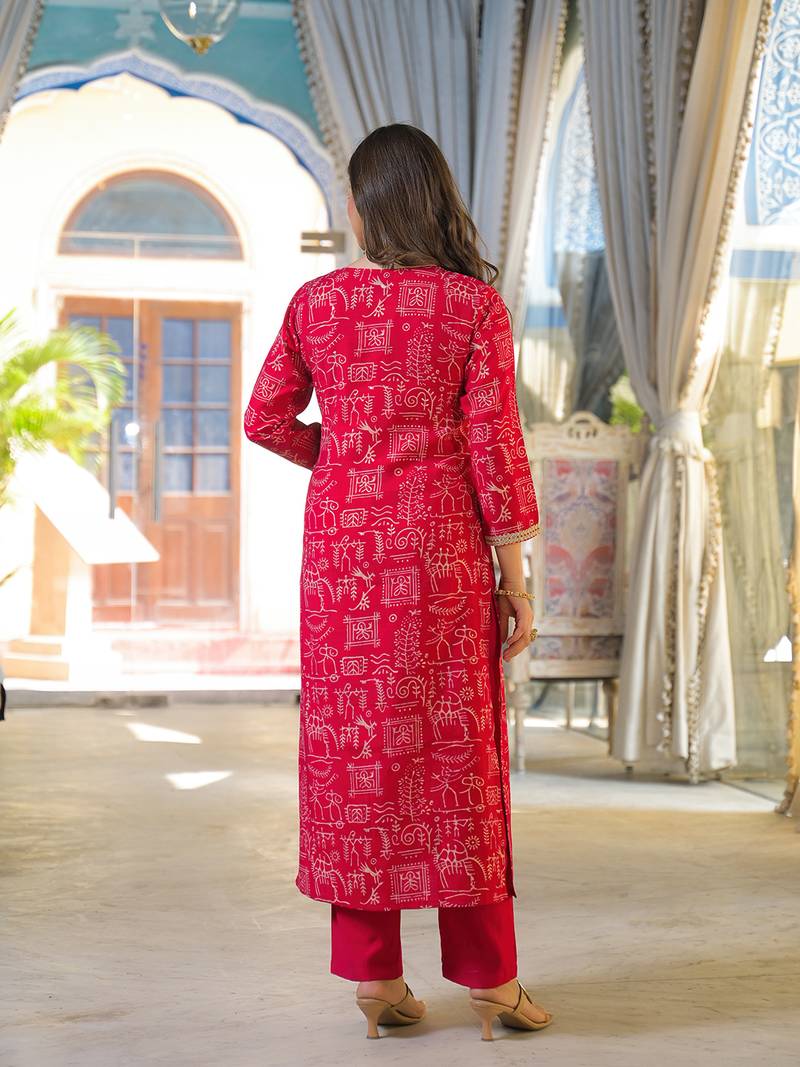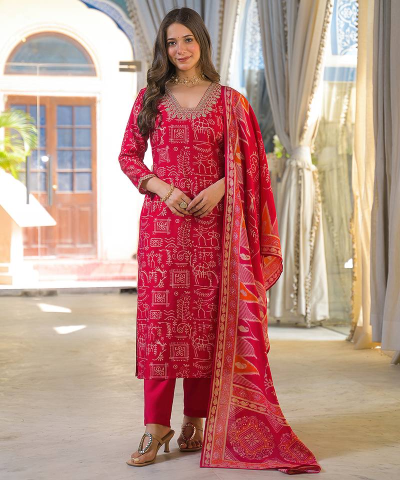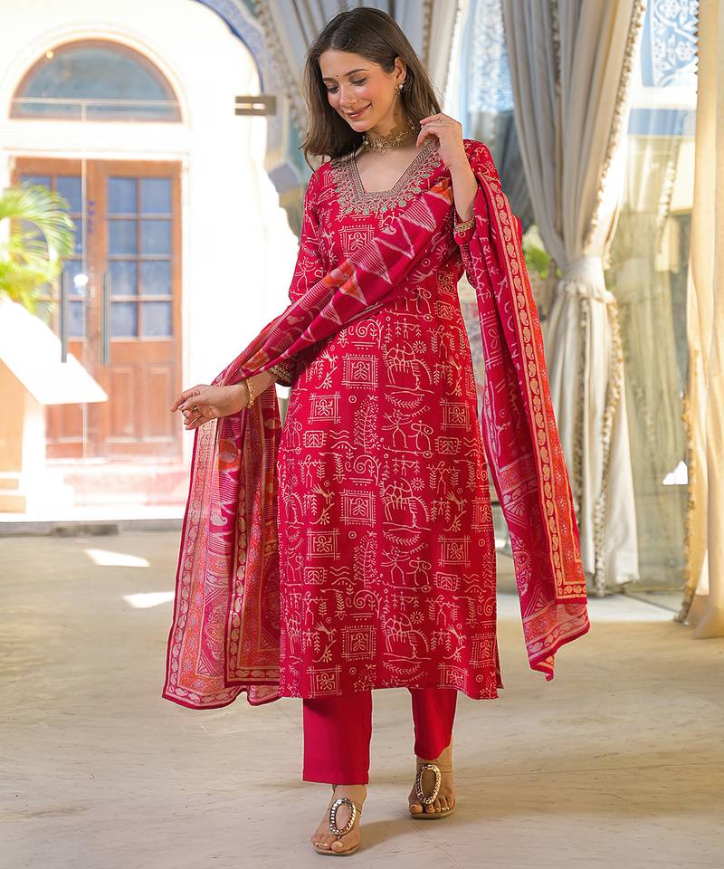 Product Name Women Red Viscose Ethnic Motifs Printed Straight Kurta Trousers With Dupatta