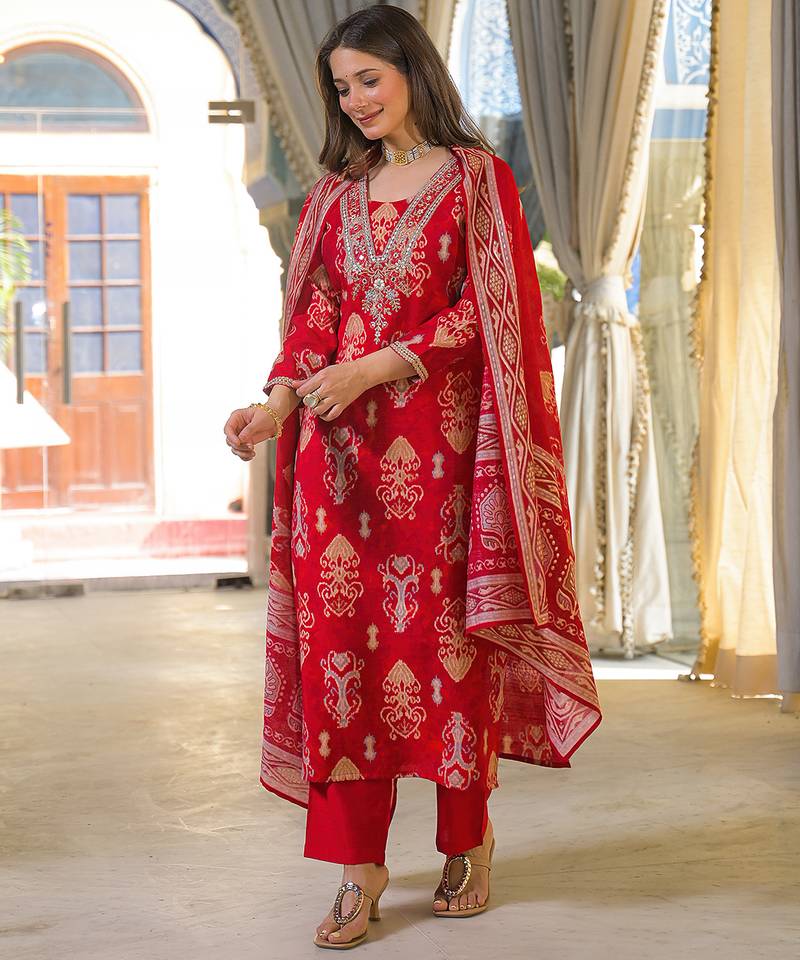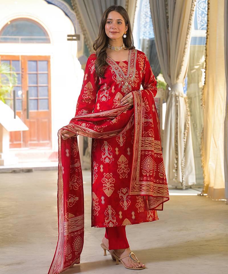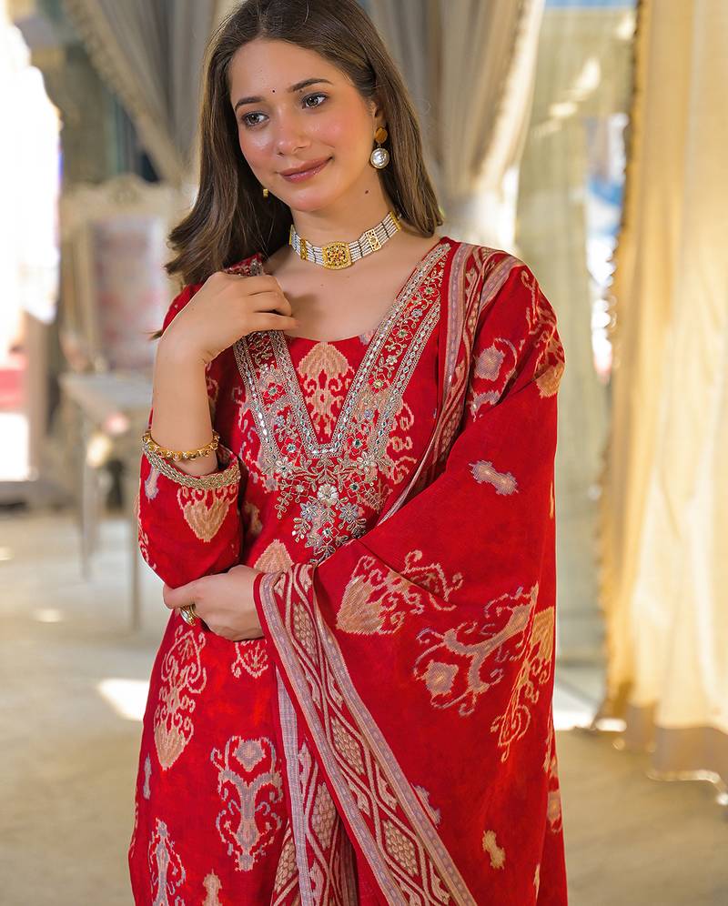 | Product Name | Women Red Viscose Ikat Printed Straight Kurta Trousers With Dupatta | |